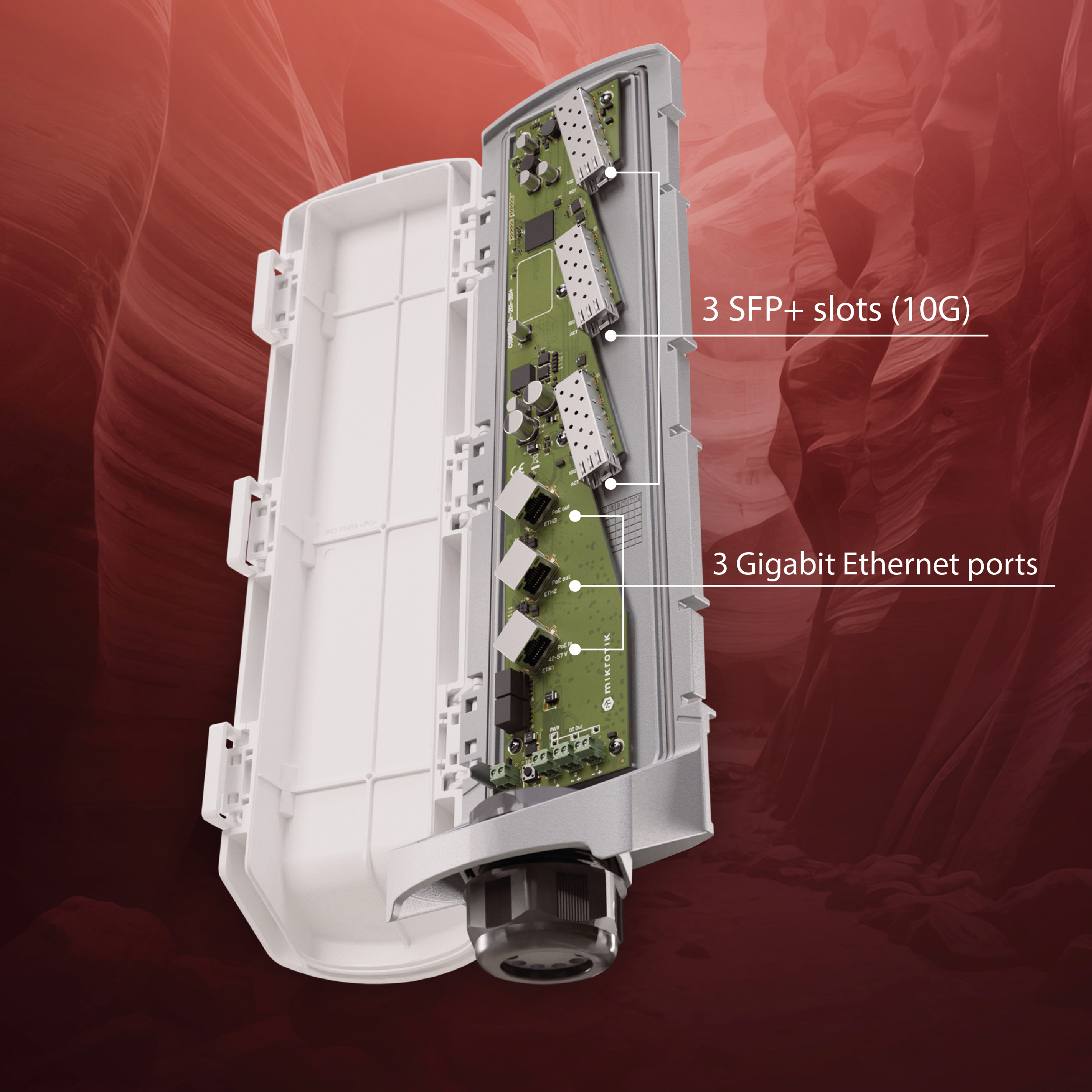 MikroTik GPERx6 outdoor switch 3x GE, 3x SFP+, PoE-in, 2x PoE-out, 3x DC-out