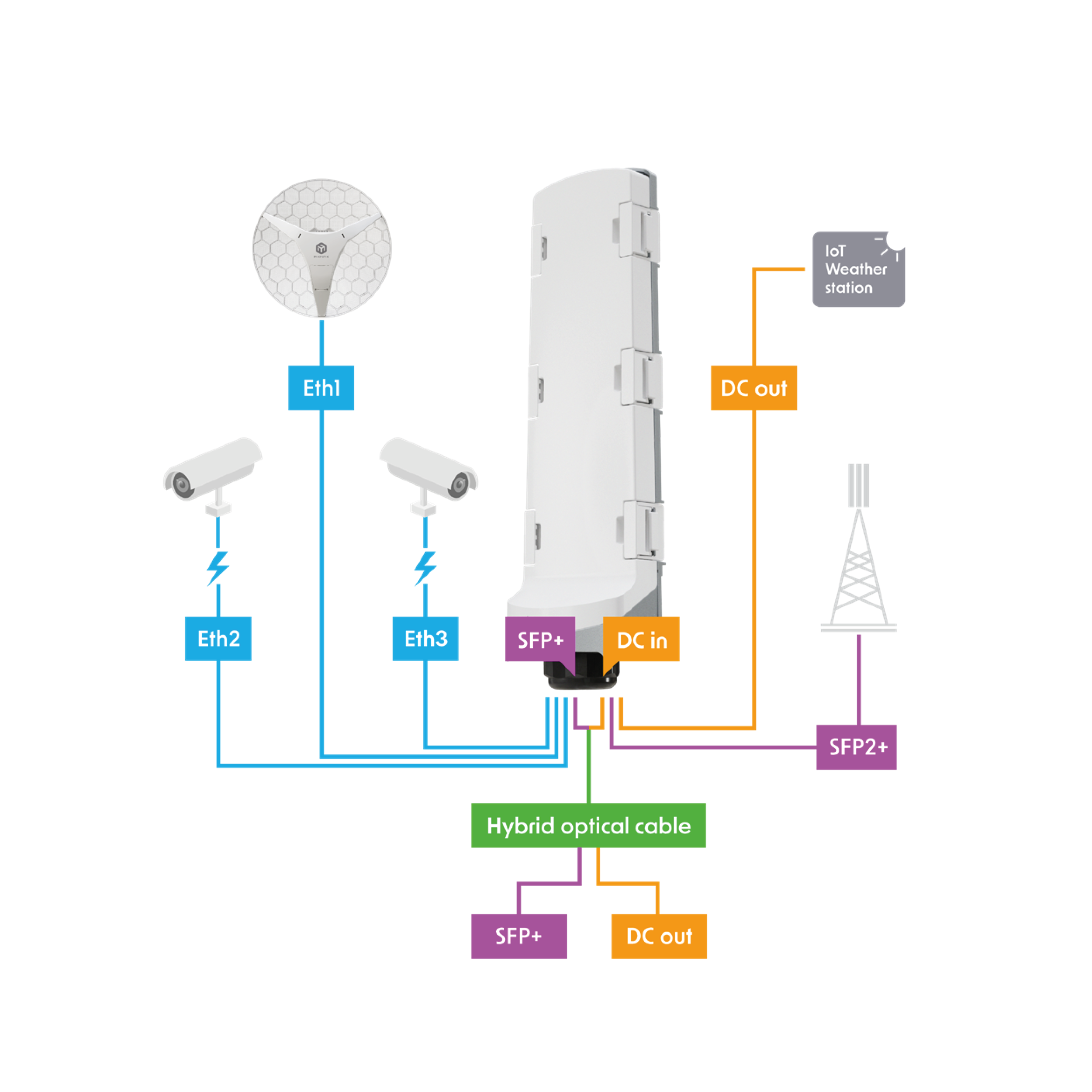 The offered product is designed as a switch for direct pole mounting, allowing the connection and simultaneous powering of other devices. Thanks to the use of various interfaces (fiber and Ethernet) and PoE and DC power outputs, it offers great flexibility. It is suitable for working with typical network devices such as base stations, IP cameras, or access points, as well as for connecting IoT solutions, such as various sensors. Additionally, the high-capacity SFP+ slots make it easier to connect two different locations from pole to pole without worrying about range.