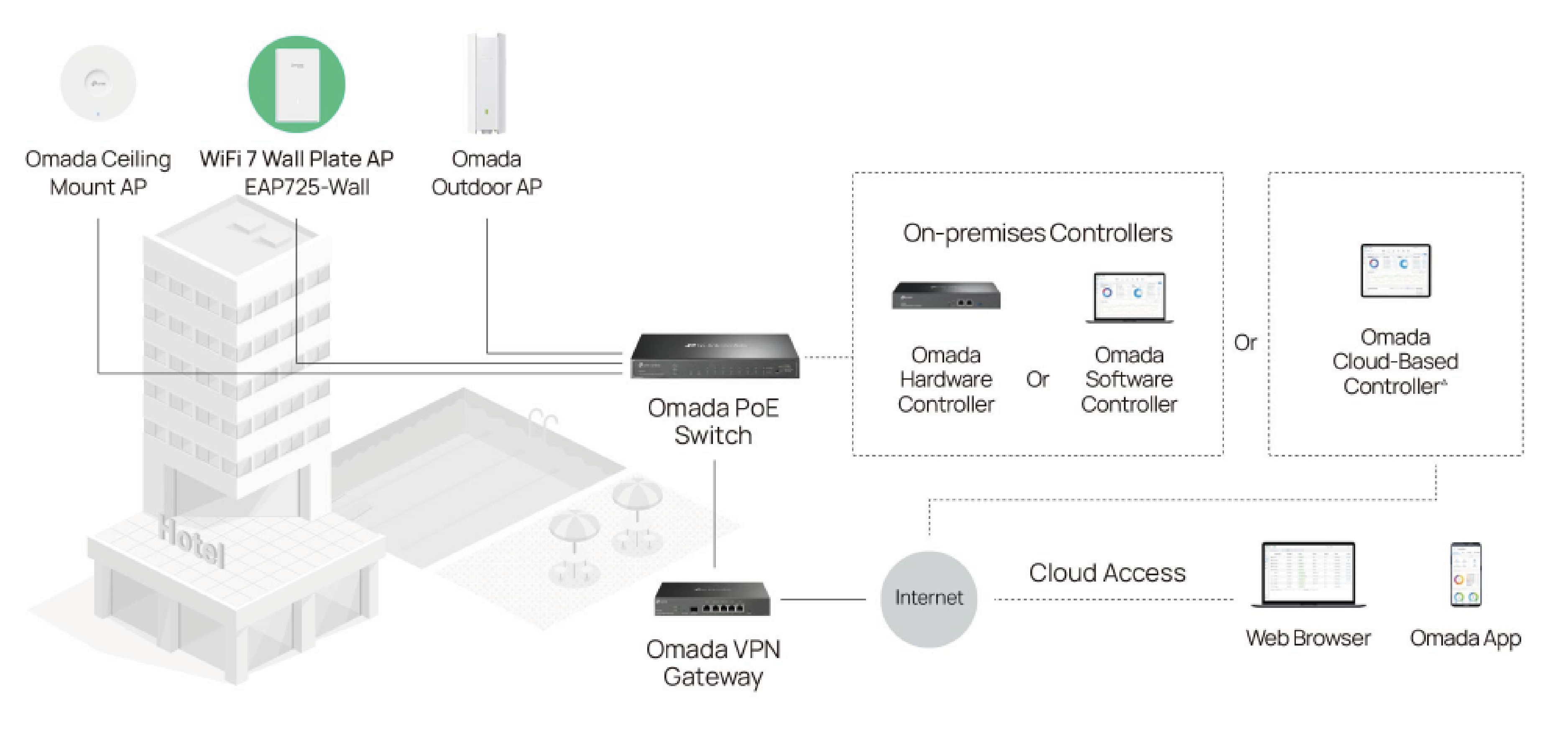 The compact wall-mounted design makes the EAP725-Wall ideal for hotel rooms, offices, and residential buildings, allowing seamless integration into the environment. The device is equipped with a 2.5G Ethernet port with PoE (802.3at), ensuring flexible deployment as well as stable power and data transmission. Additional LAN ports allow wired devices such as computers or TVs to be connected. EAP725-Wall can operate as a standalone access point or as part of a larger infrastructure centrally managed by the Omada SDN platform, which offers cloud-based management, intelligent load balancing, seamless roaming, and complete control over network configuration.