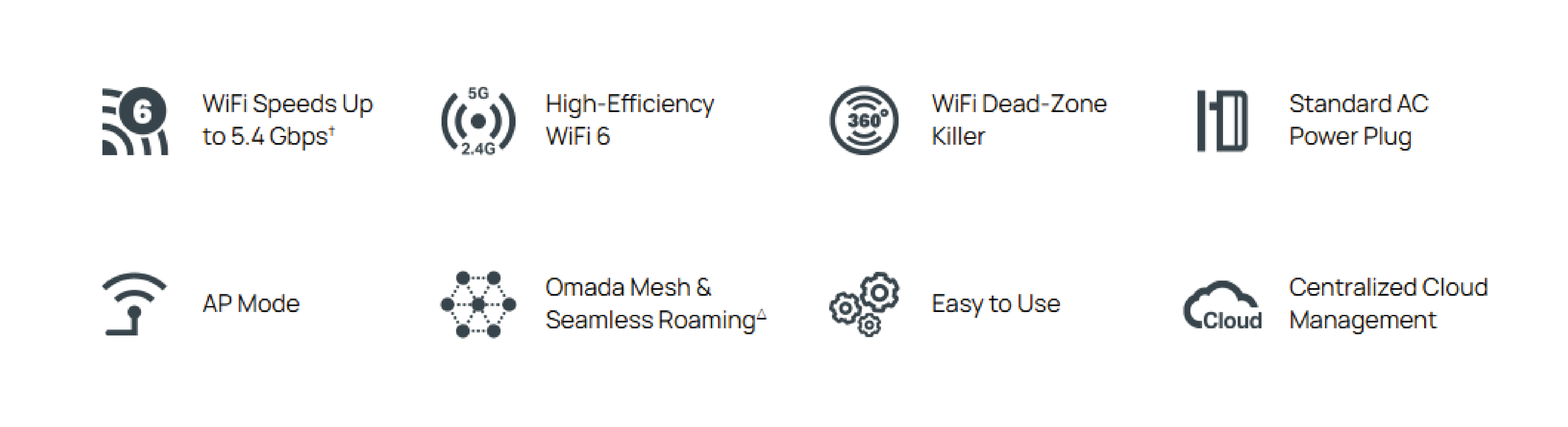 Wireless Functions | 16 SSIDs (Up to 8 SSIDs per band) Enable/Disable Wireless Radio Automatic Channel Assignment Transmit Power Control (Adjust Power based on dBm) QoS(WMM) Seamless Roaming§ Beamforming Rate Limit Band Steering Airtime Fairness Band Load Balancing Reboot Schedule Wireless Schedule RADIUS Accounting MAC Authentication Wireless Statistics Static/Dynamic IP |