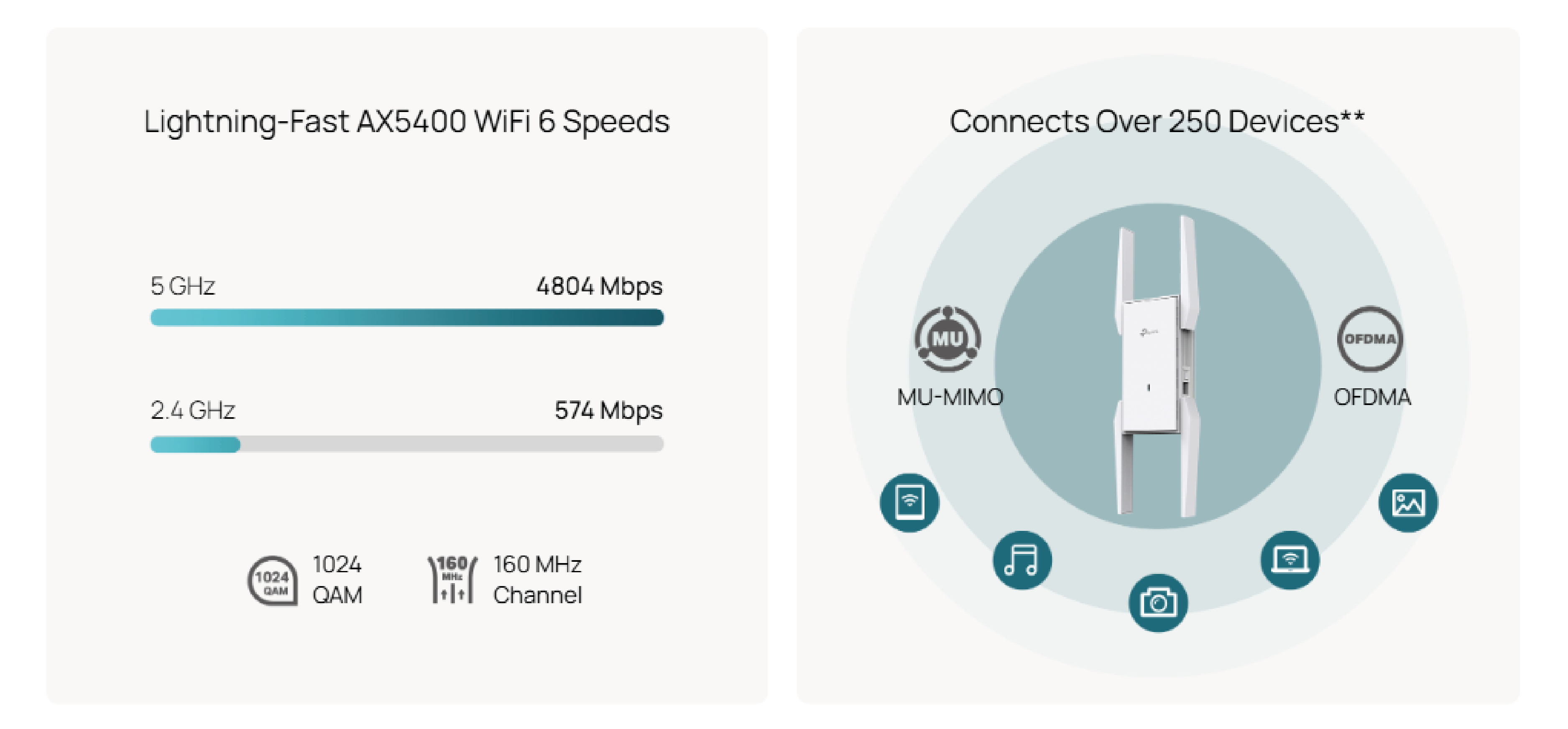 Transmission Rate | 5 GHz: Up to 4804 Mb/s 2.4 GHz: Up to 574 Mb/s |