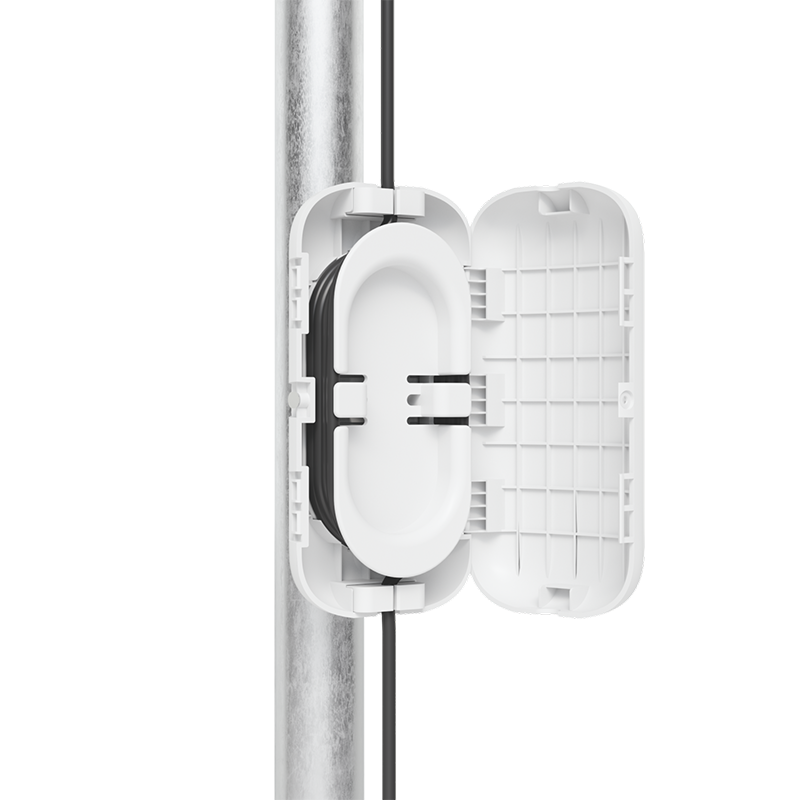 The offered product is a box made of UV-resistant polycarbonate. It is fully suitable for outdoor installation on a pole or wall, and the set includes a metal strap and mounting plugs. The box is designed to store excess fiber optic cable and is useful for various installation scenarios.