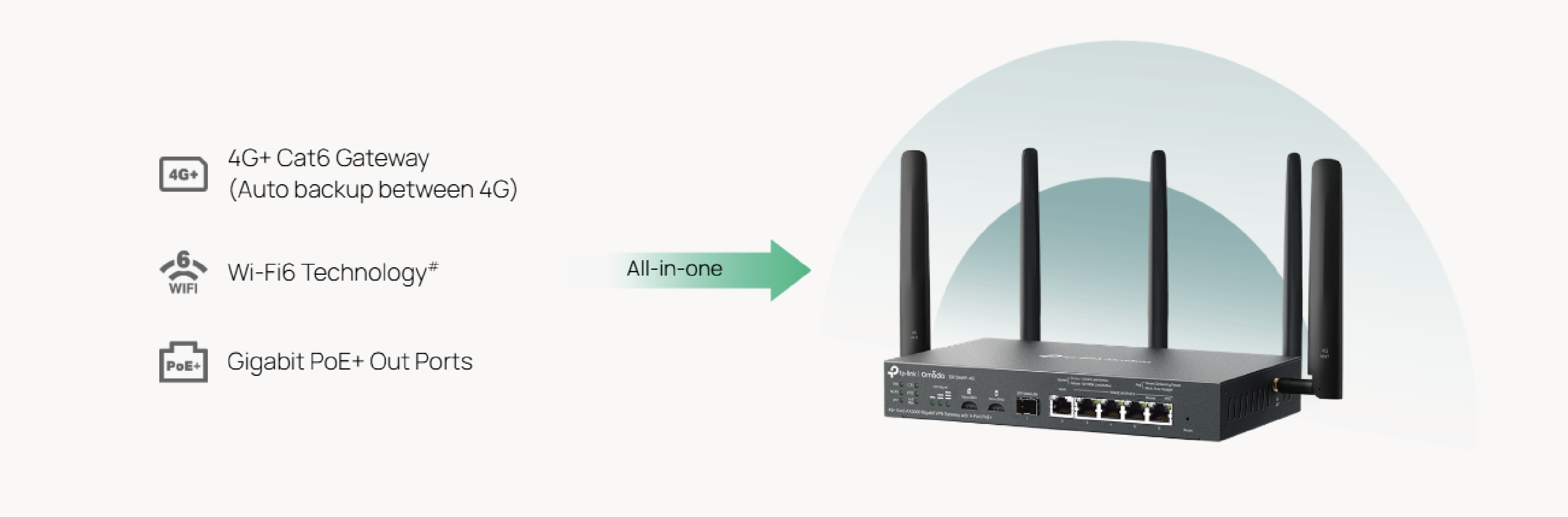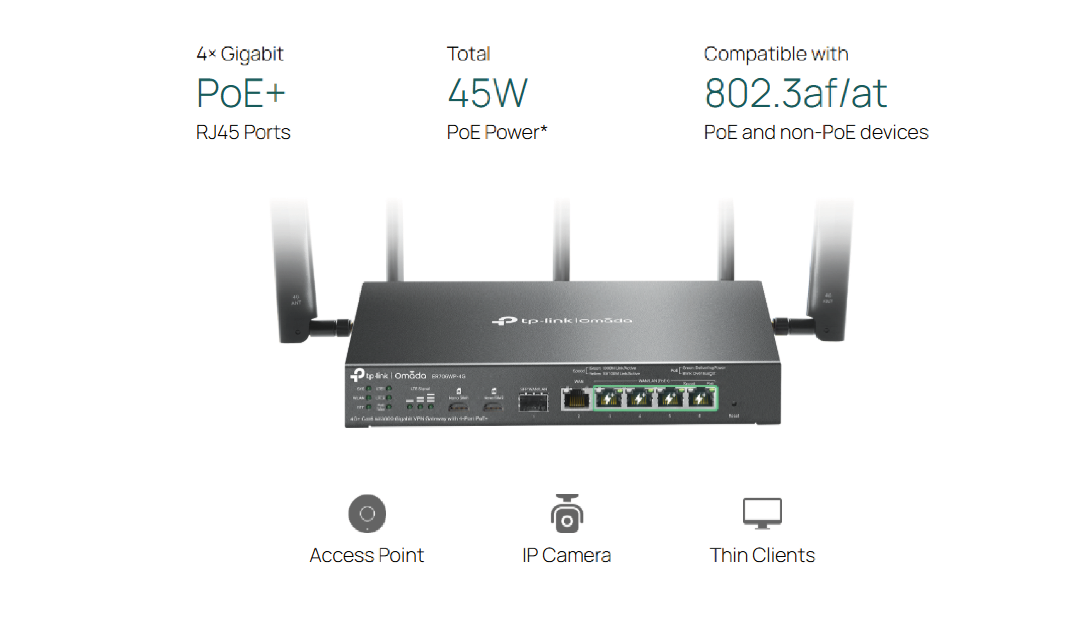 The ER706WP-4G combines 4G Internet access, Wi-Fi 6 technology, and 4 Gigabit PoE+ ports.