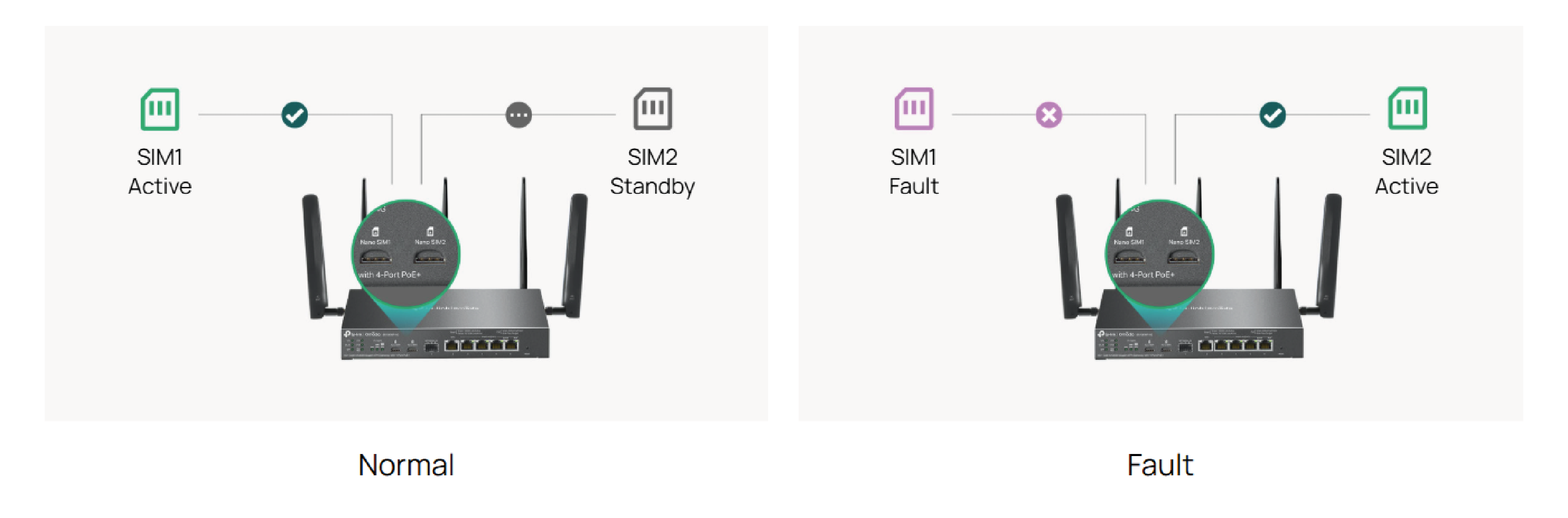 Two SIM card slots ensure business continuity and redundancy even in scenarios where other backup WAN connections fail.