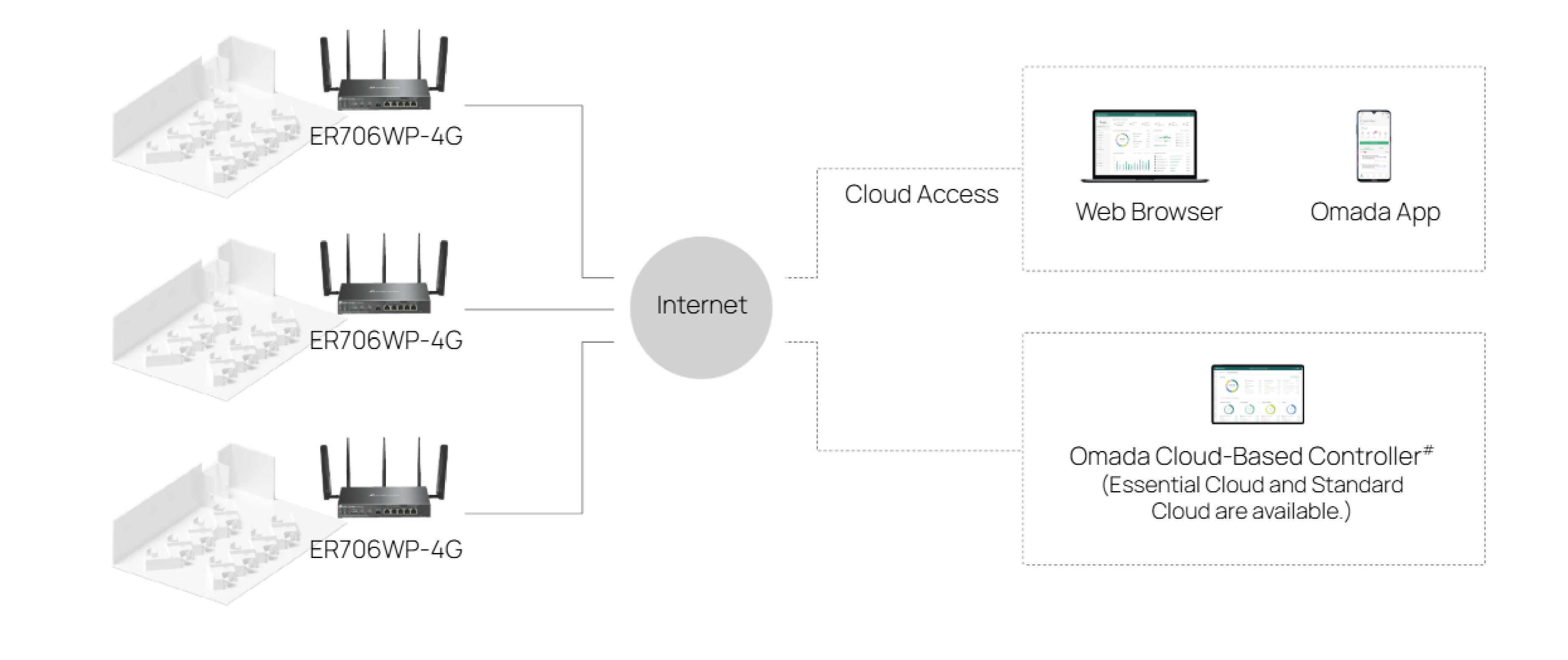 Centralized Cloud Management for Omada Gateways, Switches, and Access Points located in multiple locations, thanks to the Cloud-based Omada Controller, offering a free Essentials version of cloud services and reducing maintenance costs.