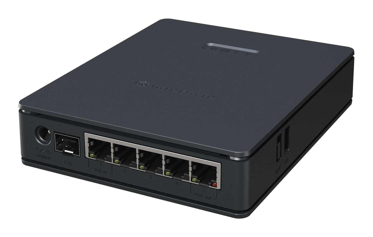 The offered product features a desktop-type casing, similar to those used in other devices from the hAP / hEX series. Power can be supplied via the DC socket (12–28 V) or passive PoE (18–28 V). The maximum power consumption of the device itself (without the PoE output) is 11 W.