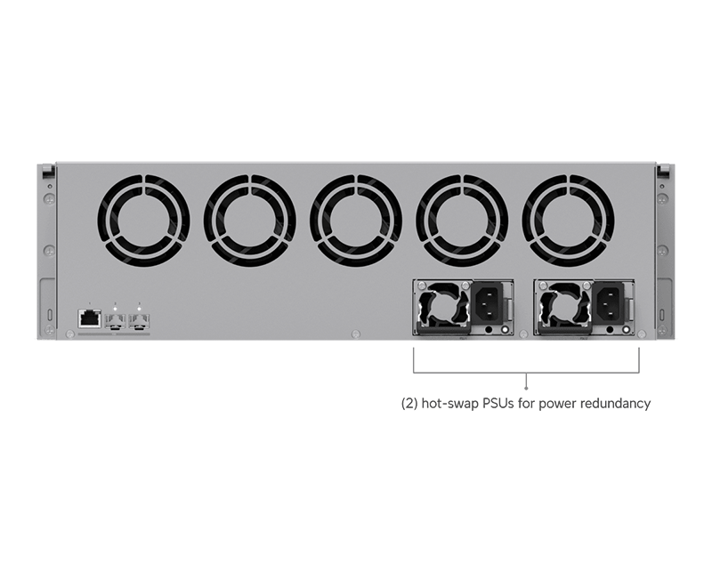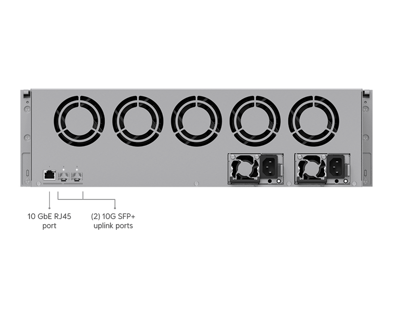 Do podłączenia z siecią możesz wykorzystać jeden z 2 slotów SFP+ (10G) lub port 10G Ethernet. Urządzenia zapewnia wysoką przepustowość transmisji, która jest niezbędna przy podłączeniu tak wielu kamer.