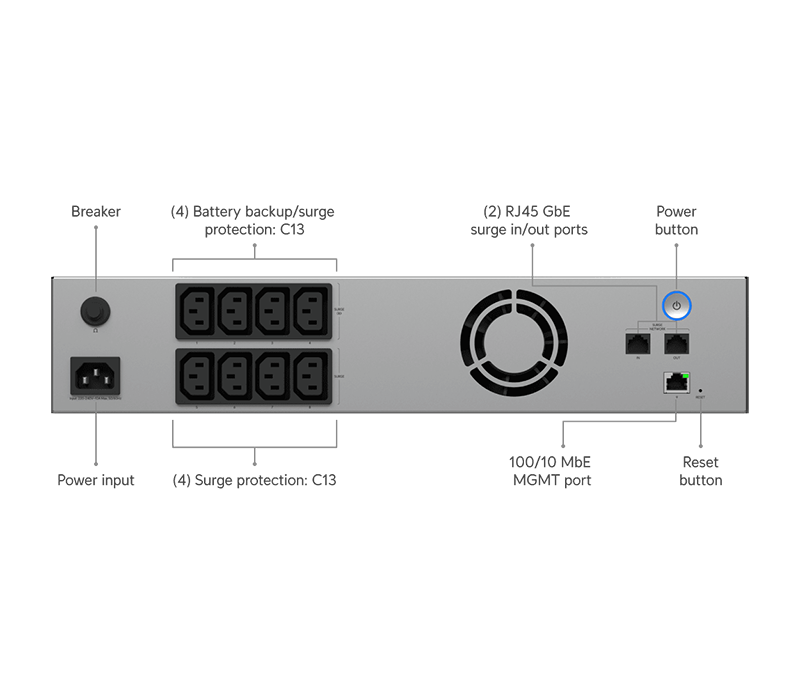 On the rear of the enclosure, there are a total of 8 C13 outlets divided into two sections. The 4 outlets located at the top provide backup power and surge protection, while the outlets at the bottom provide surge protection only. Additionally, below them there are two 1G Ethernet ports that can be used for surge protection of a single Ethernet transmission. The UPS enclosure is designed for installation in a 19" rack cabinet and occupies 2U of height.