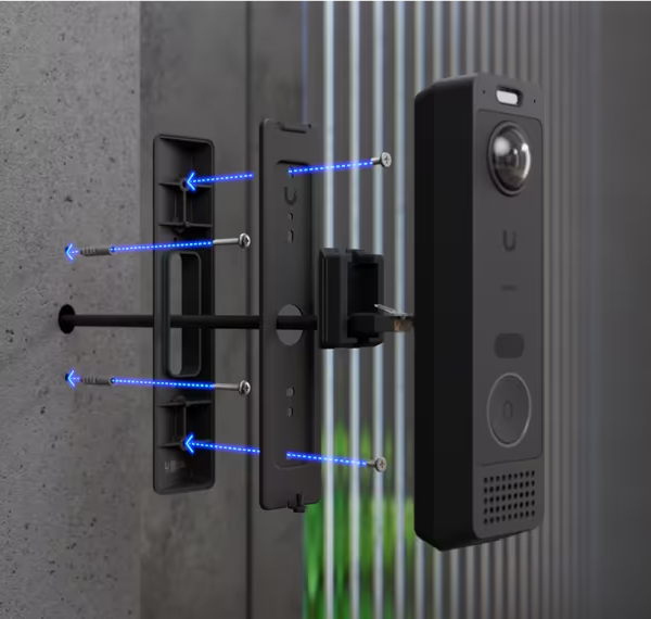 The Ubiquiti G6 Entry is a reader/doorbell designed to work within the UniFi Access system. It features two cameras: one 5 MP camera facing forward and one 8 MP camera facing downward. The forward-facing camera is used for video calls with visitors and has a field of view of 100° horizontal and 135° vertical (180° diagonal). The downward-facing camera is designed to monitor packages left by couriers, with a field of view of 66° horizontal and 51.7° vertical (78° diagonal). The reader is equipped with a physical doorbell button and has a built-in microphone and speaker for video calls. Users can unlock doors via the app, using an NFC card/keyfob, or through Apple/Google Wallet. The camera supports facial recognition and intelligent detection of people, vehicles, and animals. The enclosure has an IP55 protection rating and is suitable for wall or flush-mount installation. The package includes all necessary mounting accessories, including a bracket for angled installation. At the back of the device is a 1G Ethernet port, which also serves as the PoE+ (802.3at) power input. The reader must be connected directly to a UniFi Access hub.