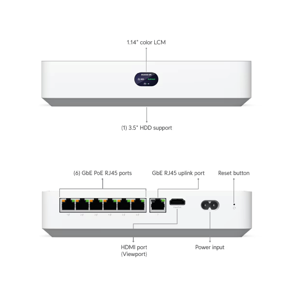 (1) GbE RJ45 uplink port (6) GbE PoE RJ45 downlink ports (1) HDMI port (Viewport) |