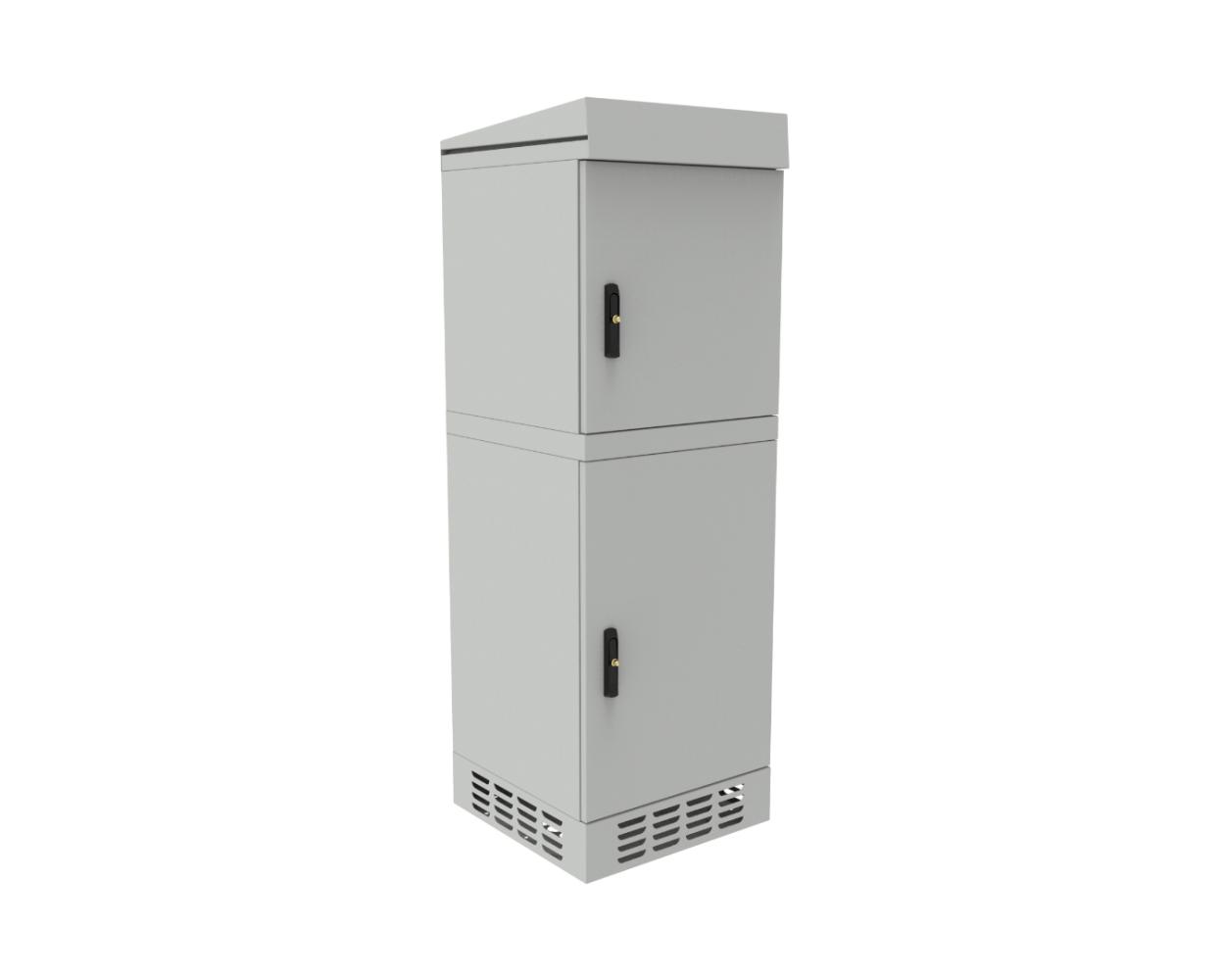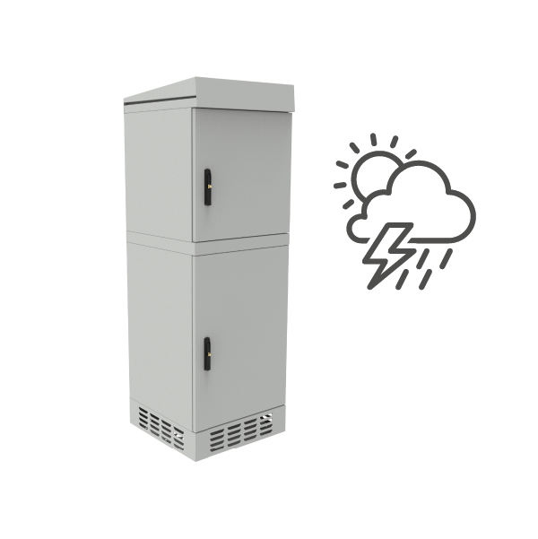 The cabinet features an IP54 protection rating and is suitable for outdoor use. The design is protected against water and dust ingress. As a freestanding cabinet, it can be appropriately anchored to the ground (e.g., concrete), mounted on a telecommunications manhole, or placed on a pedestal (sold separately).