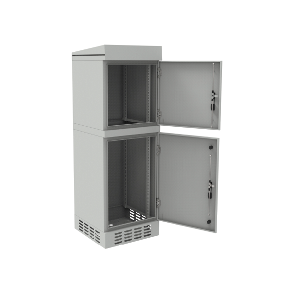 The offered product is a telecommunications cabinet in the 19" Rack standard. Its external dimensions are 61 x 183 x 61 cm, consisting of two modules: 12U + 18U (30U total). It features a single-wall, two-chamber construction and is made of steel sheet with a Magnelis coating. In the bottom part, there are 6 holes (38 mm diameter) for cable routing. Inside the cabinet, there are 4 rack rails with a mounting depth of 420 mm.