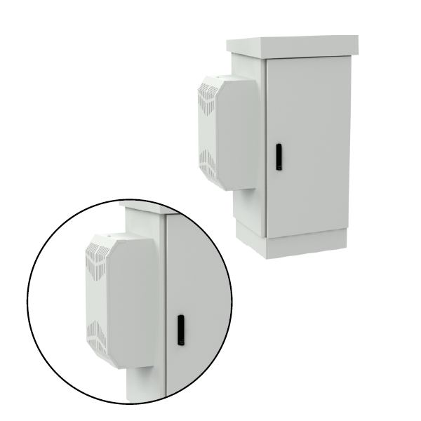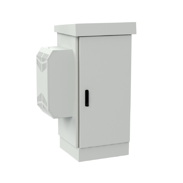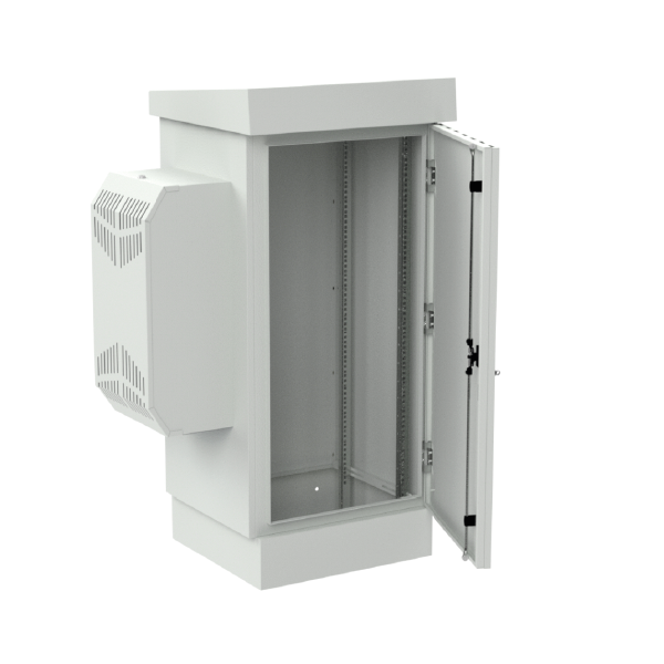 Thanks to the air conditioner, the cabinet does not have ventilation holes in the lower section (unlike standard outdoor freestanding cabinets), resulting in an IP65 protection rating, which is higher than in cabinets without air conditioning (IP54). The construction is protected against water and dust ingress. It is a freestanding cabinet that can be anchored to the ground (e.g., concrete), mounted on a telecommunications manhole, or placed on a pedestal (sold separately).