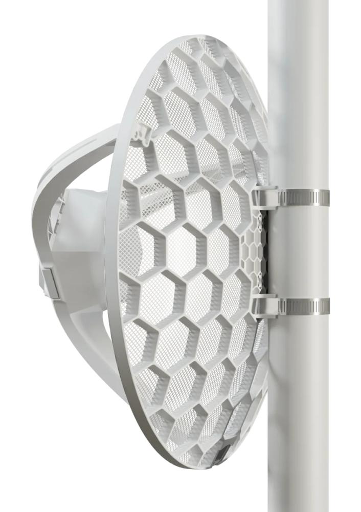 MikroTik LHGG LTE7 kit is an integrated wireless device equipped with an LTE category 7 modem. The maximum theoretical data throughput is 300 Mb/s for downloads and 100 Mb/s for uploads. The product is the direct successor to the previously sold LHGG LTE6 kit. It provides higher upload speed and two additional frequency bands, and is also sold at a lower price. The LHGG LTE7 kit has an integrated mesh antenna well known from the entire LHG series, with a gain of 17 dBi. Thanks to this, the device is suitable for locations far from the base station where other solutions have trouble establishing a connection, for example in rural areas. The LHGG LTE7 kit is equipped with 1 × 1G Ethernet port (10/100/1000 Mb/s), which also serves as the PoE power input. The input voltage range is 12–57 V DC; you can use passive PoE or 802.3af/at. The device is fully adapted for outdoor use, and with the mount included in the set, you can install it on a pole.