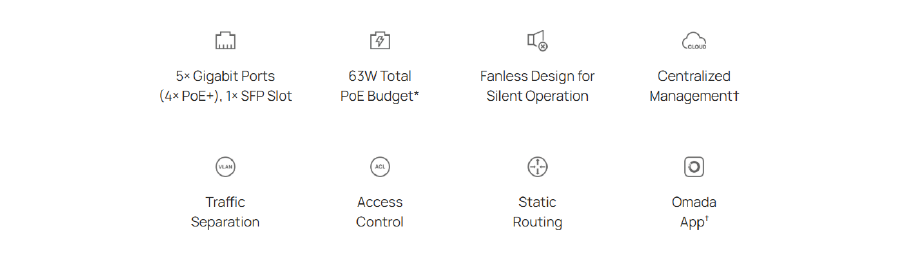 Ports     4× 10/100/1000 Mbps RJ45 PoE+ Ports