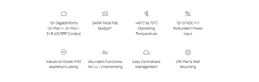 | Porty | 2 porty RJ45 PoE++ 10/100/1000 Mb/s 6 portów RJ45 PoE+ 10/100/1000 Mb/s 2 gigabitowe porty Combo SFP/RJ45 Automatyczna negocjacja / Automatyczne MDI/MDIX |