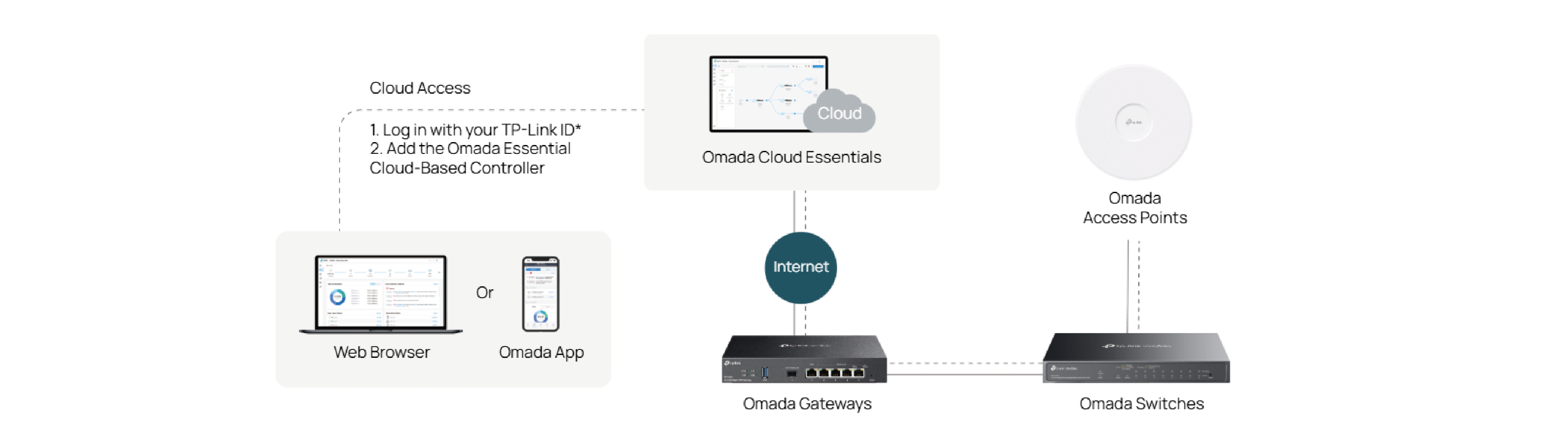 Omada Cloud Essentials jest bezpłatnym i prostym w użytkowaniu rozwiązaniem do zarządzania siecią Omada w Chmurze§. Obejmuje punkty dostępowe, przełączniki i bramy sieciowe. Umożliwia łatwe i scentralizowane zarządzanie siecią oraz monitorowanie jej za pomocą podstawowych funkcji, dzięki czemu znajdzie swoje zastosowanie w sieciach monitoringu i małych firmach, które nie wymagają złożonych operacji.