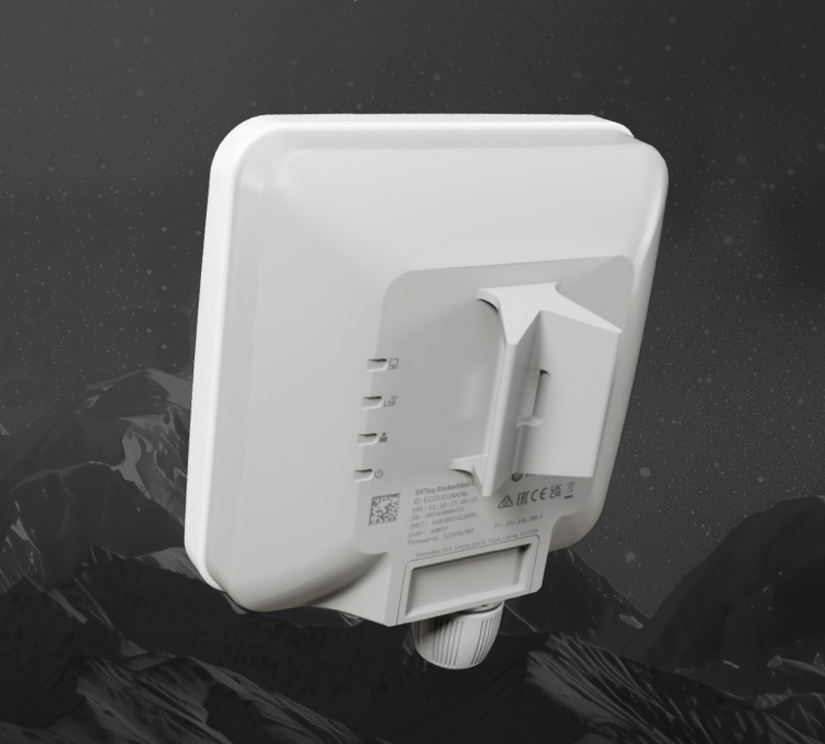 MikroTik EC25-EU&SXTsq is an integrated wireless device equipped with a LTE Cat. 4 modem and a directional antenna with a 9 dBi gain. The maximum theoretical mobile connection speed is 150 Mb/s for downloads and 50 Mb/s for uploads. The enclosure is fully designed for outdoor use, featuring an IP67 protection rating. The device has a Nano SIM slot for card connection and also supports eSIM functionality. The SXTsq includes 1 Gigabit Ethernet port, which simultaneously serves as a PoE input (passive or 802.3af/at, 12–57 V DC).