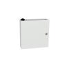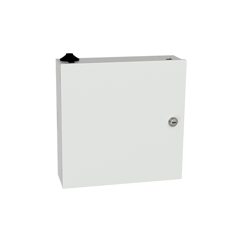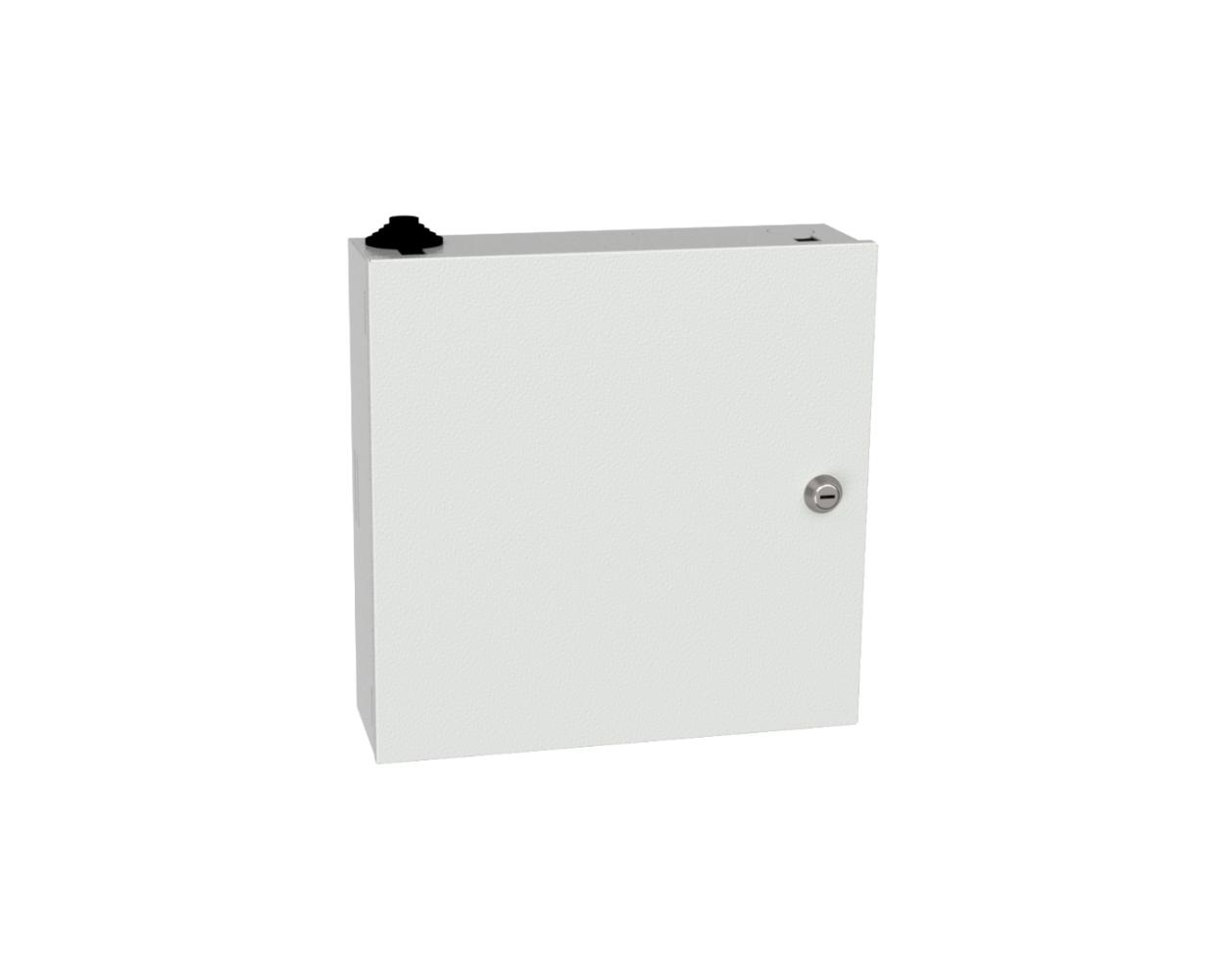 The offered product is an access distribution box designed for wall-mounted installation inside buildings. It is made of steel sheet coated with a Magnelis layer and painted in light gray color RAL7035. The manufacturer has used solid doors secured with a standard key lock. The protection rating is IP41, and the mechanical resistance is IK10.