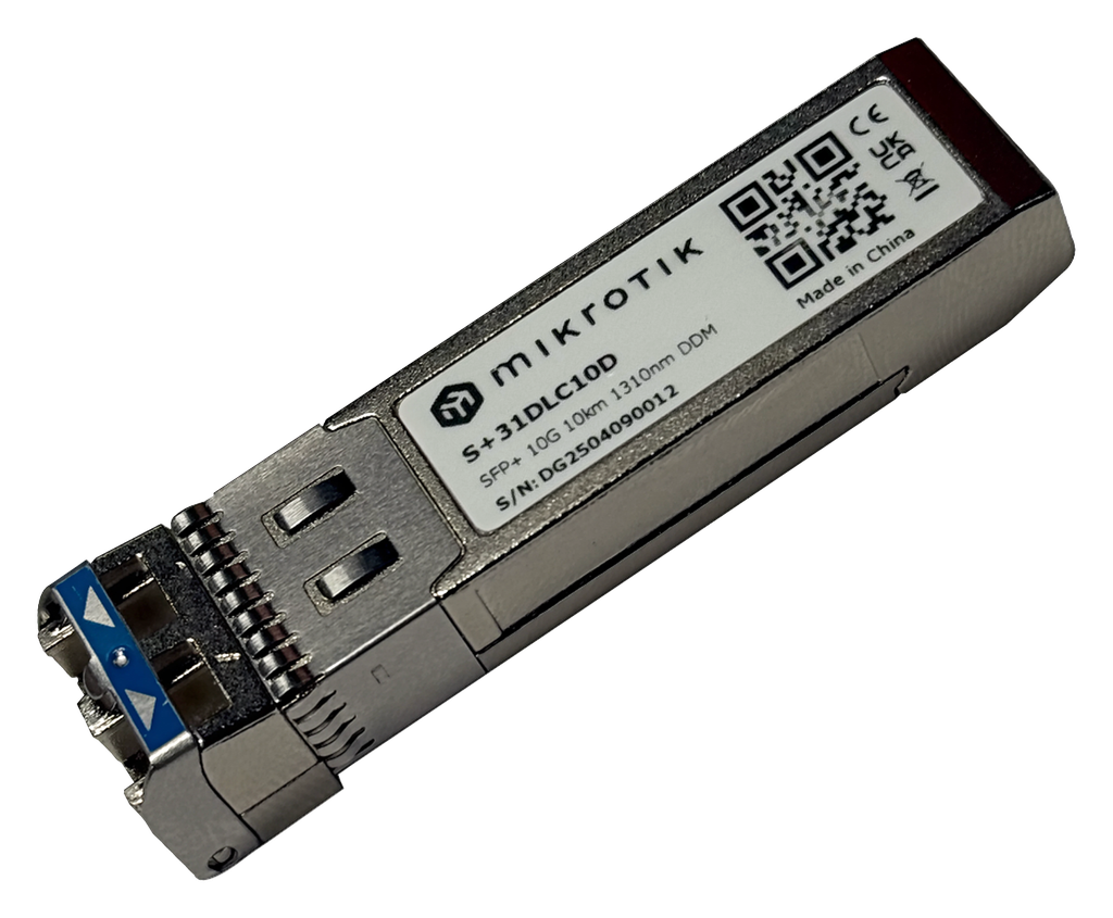 The MikroTik S+31DLC10D is an SFP+ optical transceiver equipped with two LC/UPC connectors (duplex). It is designed for transmission over two single-mode fibers, operates at a wavelength of 1310 nm, and supports a maximum range of 10 km. The offered product is available at a lower price than universal 1 / 10 / 25 Gb/s modules, making it an excellent choice for networks where speeds higher than 10G are not required. The optical module is compatible with all MikroTik devices and supports DDM, allowing monitoring of optical power, voltage, temperature, and other key parameters.