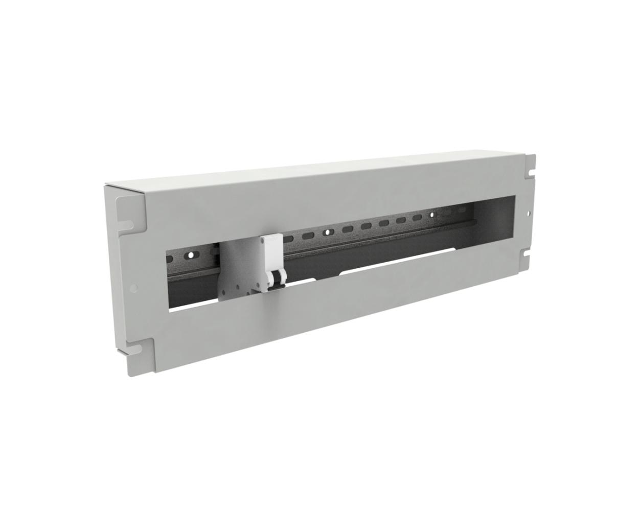 The offered product is a 3U high panel designed for use in 19" Rack cabinets. Inside, it features a DIN rail (TH35) with a capacity of up to 22 modules. The front is equipped with a removable cover that protects users from accidental contact with the modules mounted in the panel. Both elements are connected by a grounding wire. The entire unit is made of steel sheet with a Magnelis coating.