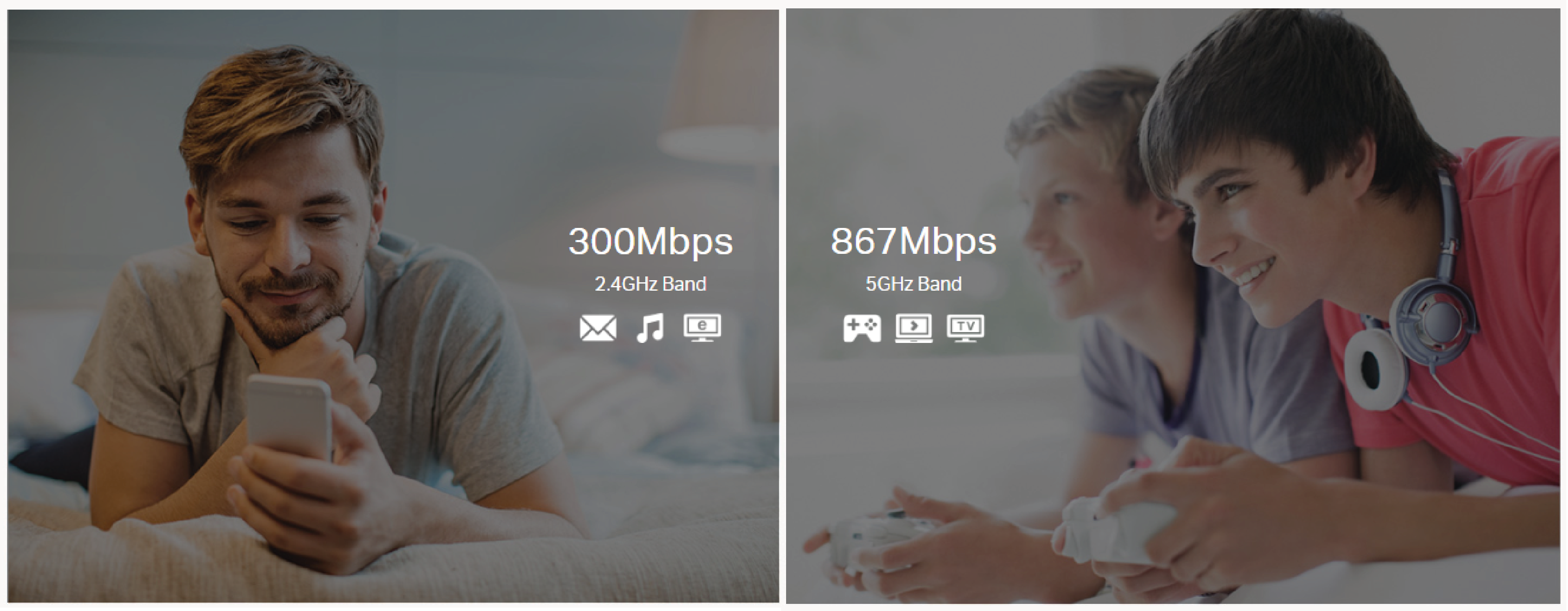 2,4 GHz: up to 300 Mb/s 5 GHz: up to 867 Mb/s |