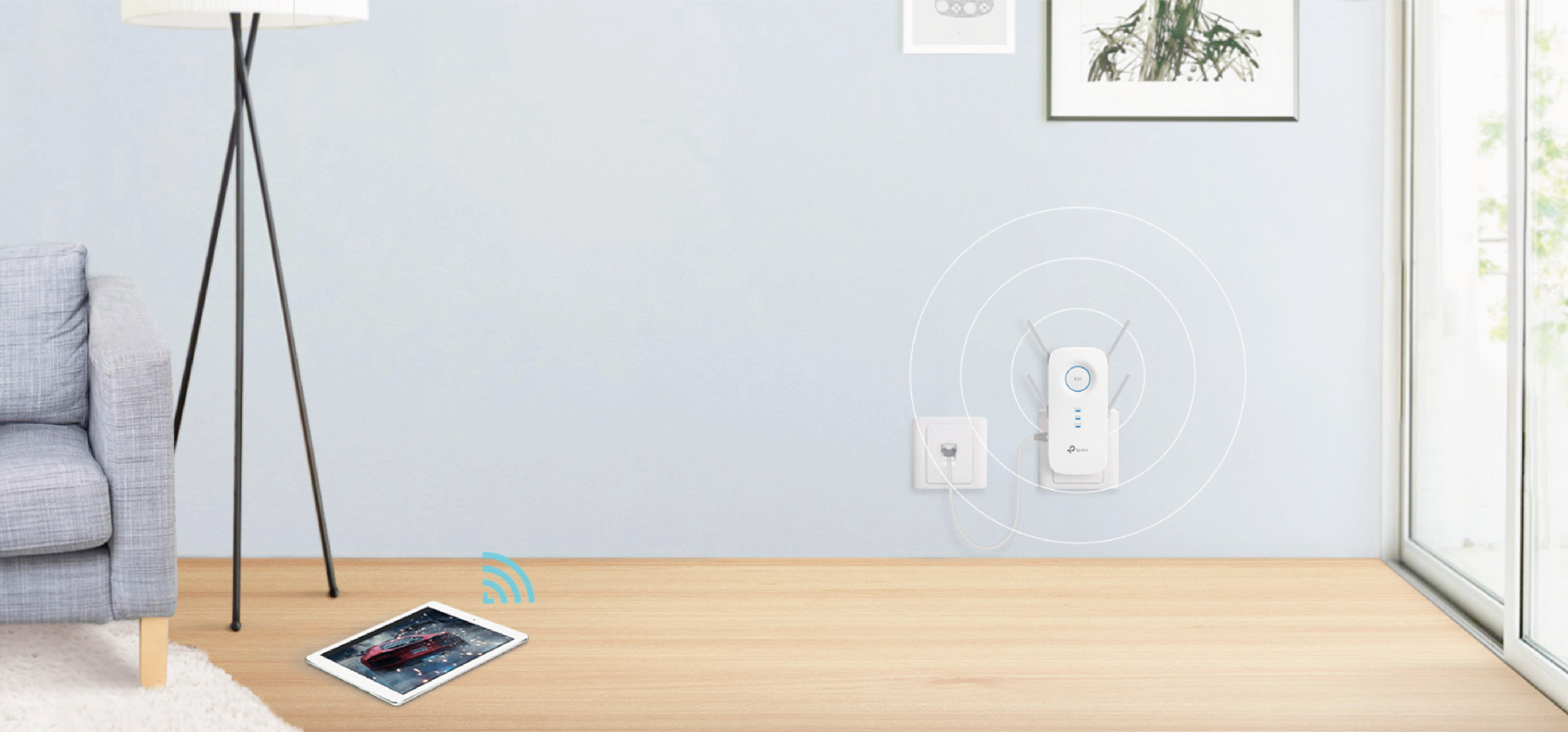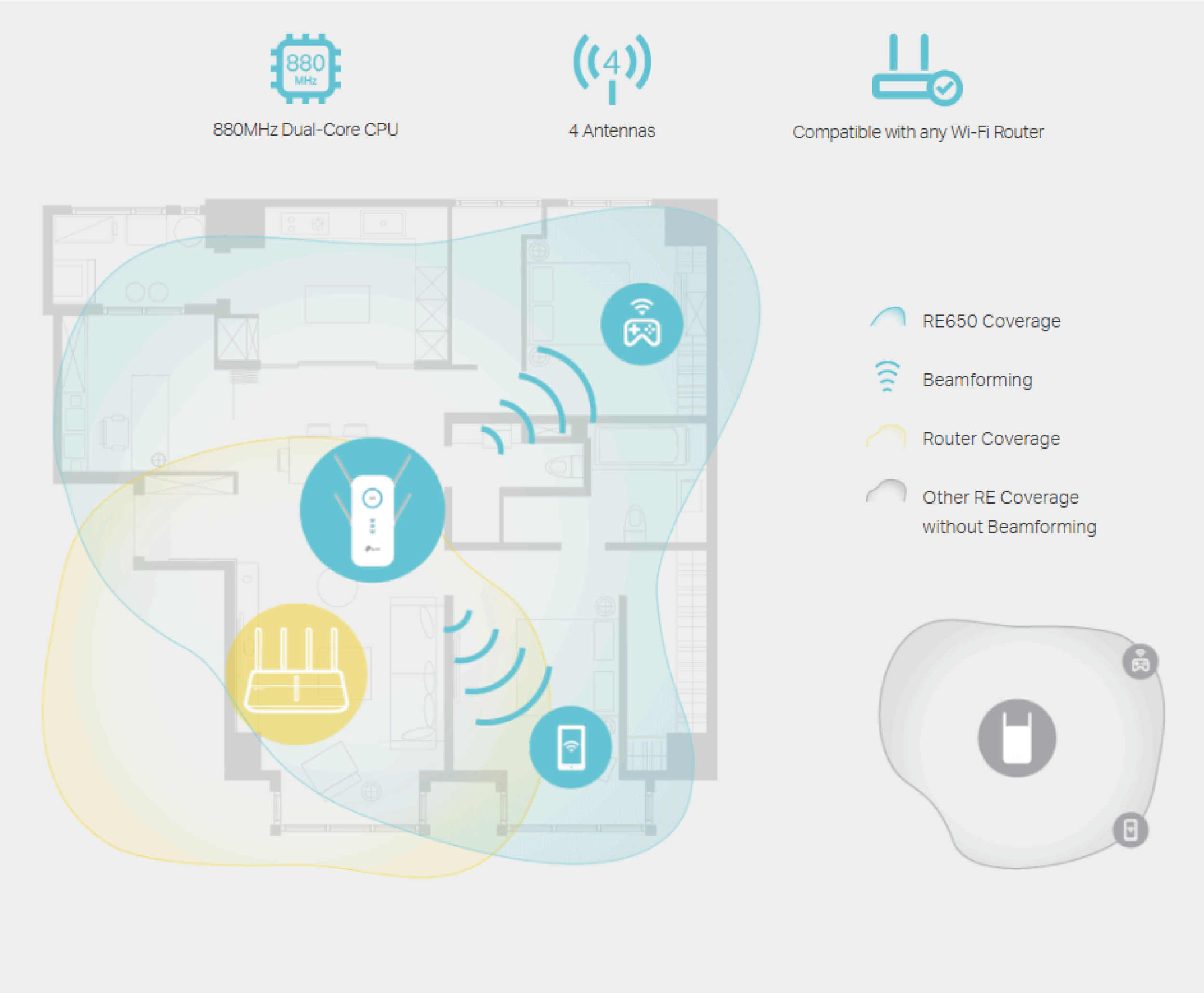 Equipped with four external, dual-band antennas, the RE650 allows you to create stable wireless connections with any Wi-Fi router and extend your network range. The 880MHz dual-core processor ensures maximum Wi-Fi performance and connection for your smartphones and tablets throughout the house. Beamforming technology allows for the detection of device locations and the transmission of the Wi-Fi signal to them, ensuring stable connections.