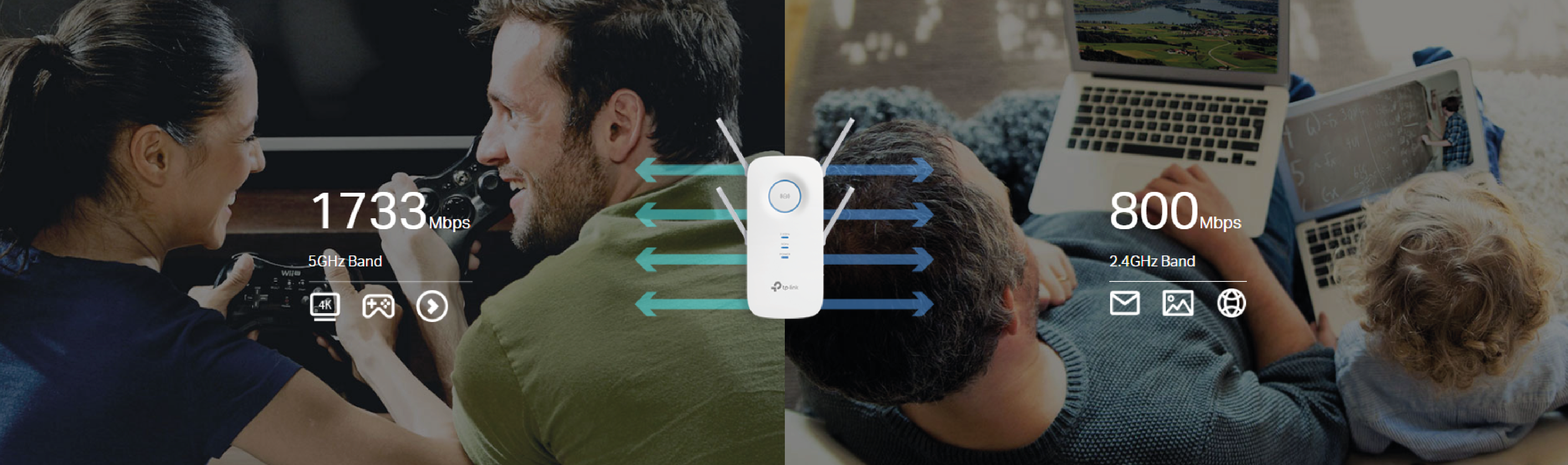 Using 8-Stream technology, which significantly enhances Wi-Fi capabilities, the RE650 achieves industry-leading, highest speeds of up to 800 Mb/s on the 2.4 GHz band and up to 1733 Mb/s on the 5 GHz band. This provides the incredible speed and efficiency necessary to handle the most demanding network activities, including 4K streaming and lag-free online gaming.