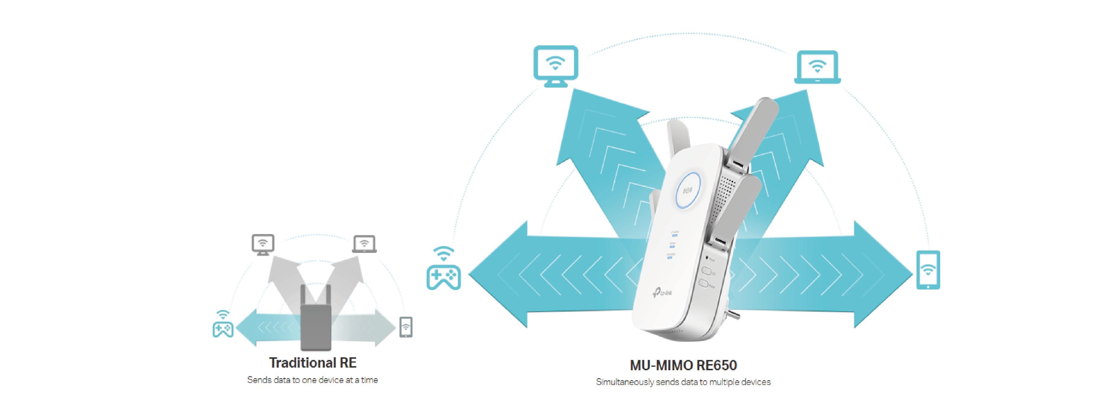MU-MIMO technology allows the RE650 to serve up to 4 devices simultaneously, reducing their waiting time and significantly increasing Wi-Fi throughput for each device. Thanks to MU-MIMO technology, the RE650 operates up to 4 times faster than a traditional AC standard network extender.