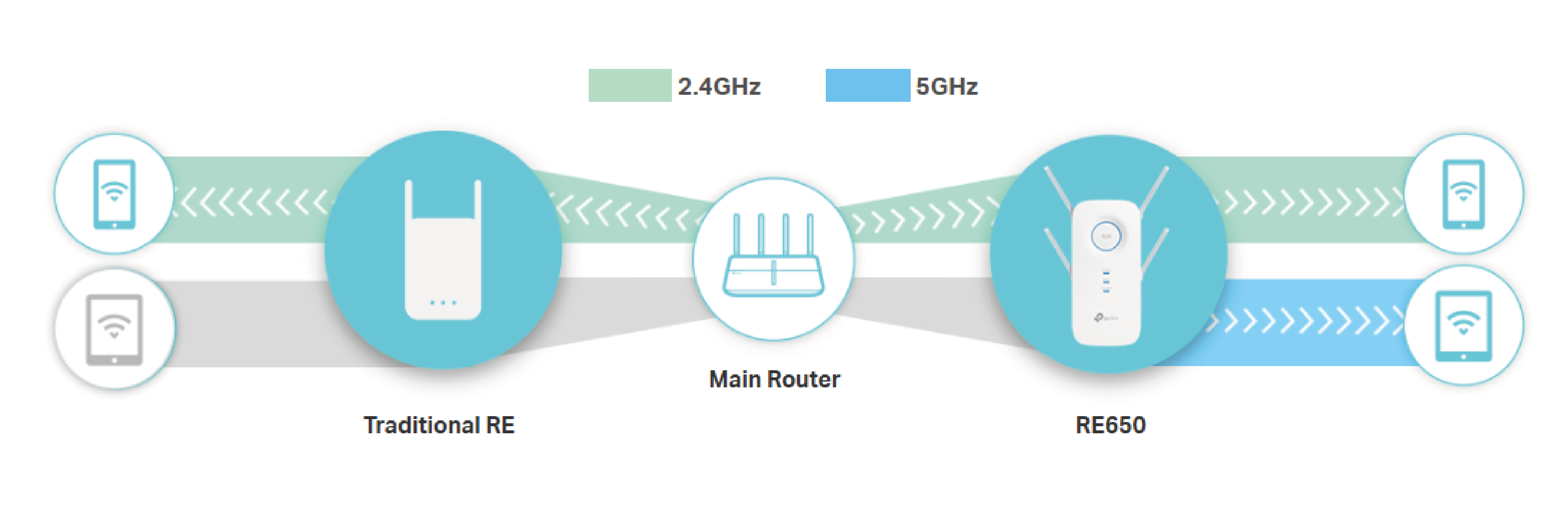 If one of the router's bands suddenly loses connection, or if the main router is a single-band device, the RE650 will provide clients with stable dual-band connections, ensuring uninterrupted activity on all your devices.