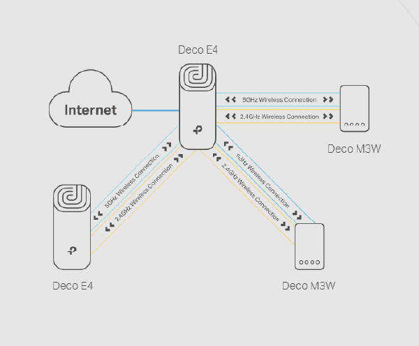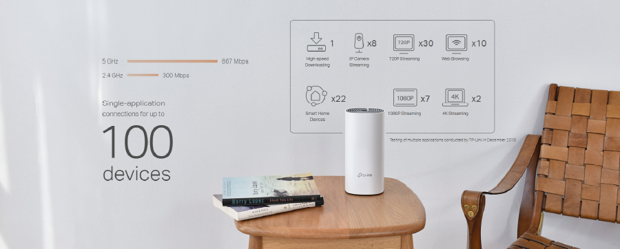 The TP-Link Deco E4 is an Access Point designed for use in a TP-Link Mesh network. It can operate simultaneously on the 2.4 GHz and 5 GHz}$ bands, supporting IEEE $802.11 b/g/n (2.4 GHz) and IEEE $802.11 a/n/ac (5 GHz) standards. It is equipped with two Fast Ethernet (10/100 Mb/s) ports, both of which can function as WAN or LAN. The maximum theoretical wireless connection throughput (according to the manufacturer) is 300\text{ Mb/s in the 2.4 GHz band and 867 Mb/s in the 5 GHz band. The E4 is TP-Link's budget solution for Mesh networks, ideal for locations where transmission throughput greater than 100 Mb/s is not required. The device can operate in three modes: Router, Access Point, or Range Extender.