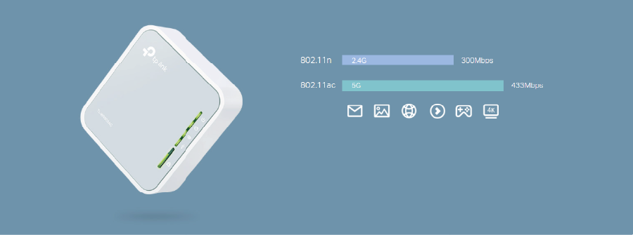 The TL-WR902AC supports 802.11ac standard wireless connections with 3 times faster speeds than previously available 802.11n standard connections, providing a total wireless network speed of 733 Mb/s.