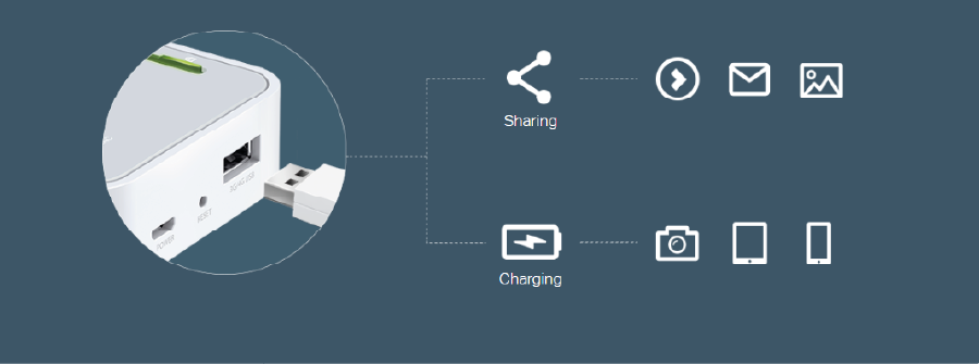 The multi-functional USB port allows you to connect an external USB drive to share files with devices on the network. The USB port can also supply power (up to 5V/2A) to portable devices, allowing for convenient charging.
