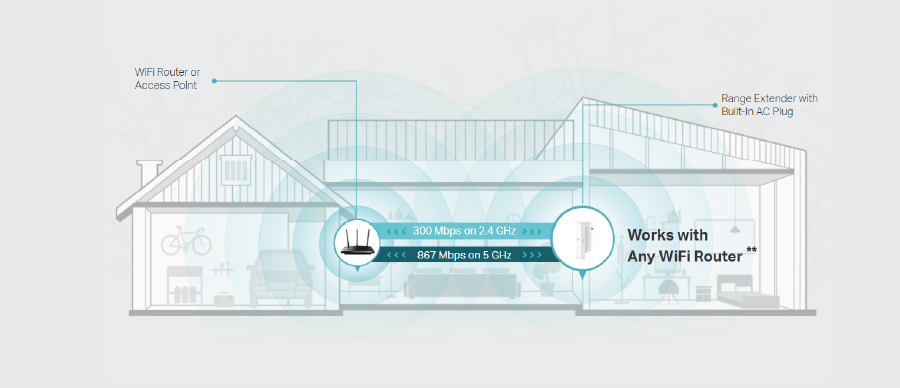 The RE300 connects wirelessly to your Wi-Fi router, boosts and expands the router's signal, sending it to areas it previously did not reach.