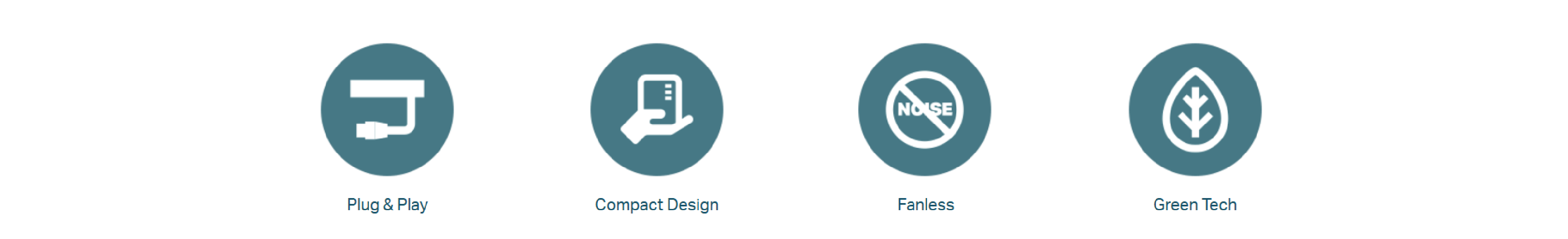 The compact size allows the device to be mounted on all countertops and desks. The absence of fans, in turn, ensures quiet operation of the switch.