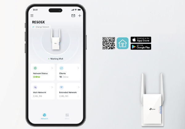 Set up your Wi-Fi network and manage your router and signal booster using the TP-Link Tether app, which you can easily download to your Android or iOS smartphone.