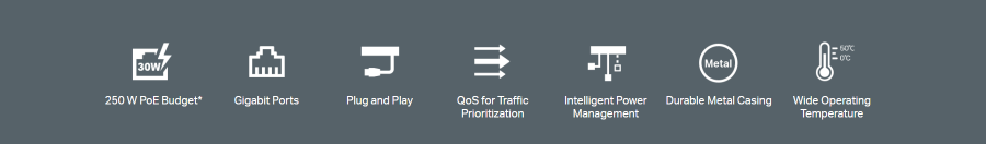 | PoE+ Ports(RJ45) | Standard: 802.3at/802.3af compliant PoE Ports: Ports 1–16 PoE Power Budget: 250 W |