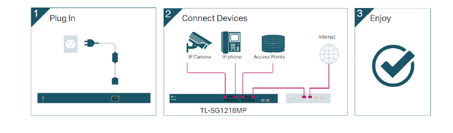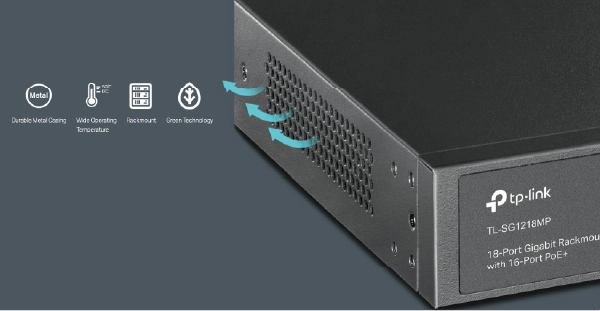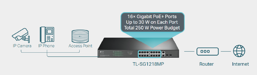 The TL-SG1218MP is fully compatible with PoE devices such as IP cameras, Access Points, and IP phones. It also works with non-PoE devices to provide Gigabit connections to computers, printers, and IP TV.