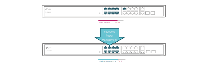 When the total power consumption exceeds $250\text{ W}$, the intelligent power consumption management feature turns off power to the port with the lowest priority to ensure power supply to ports with higher priorities, thus protecting the device from overload.