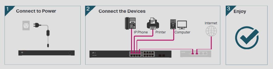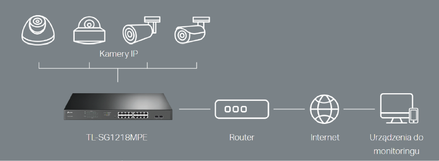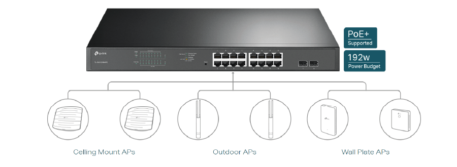 The TL-SG1218MPE switch is compliant with the 802.3af/at PoE+ standards, and each of its PoE ports delivers a power supply of 30 W. The total PoE power budget for the 16 PoE ports is maintained at 192 W, making the device an ideal complement to surveillance systems for small and medium-sized businesses.