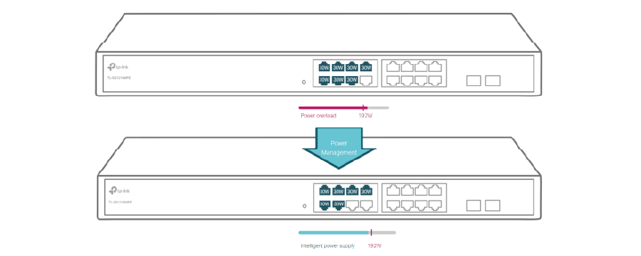 When the total power consumption exceeds 192 W, the intelligent power consumption management feature turns off power to the port with the lowest priority to ensure power supply to ports with higher priorities, thereby protecting the device from overload.