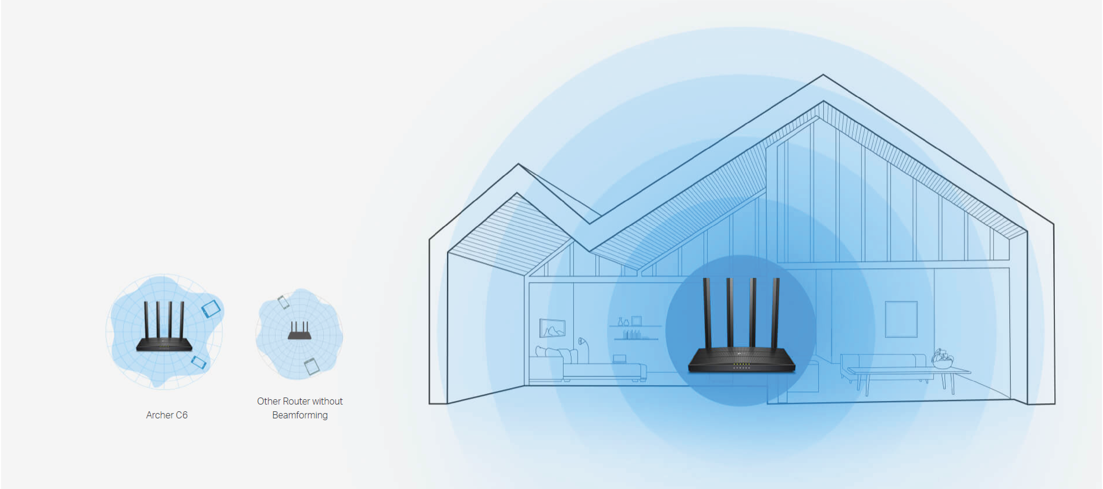 Four external antennas and one internal antenna will deliver the Wi-Fi signal to every corner of your home. Don't worry about network availability and enjoy a fast connection whether you're lounging on the couch or relaxing on the balcony. Beamforming technology allows the detection of devices and the transmission of a strong Wi-Fi signal towards them, even if they are in a distant location or have a low power level.