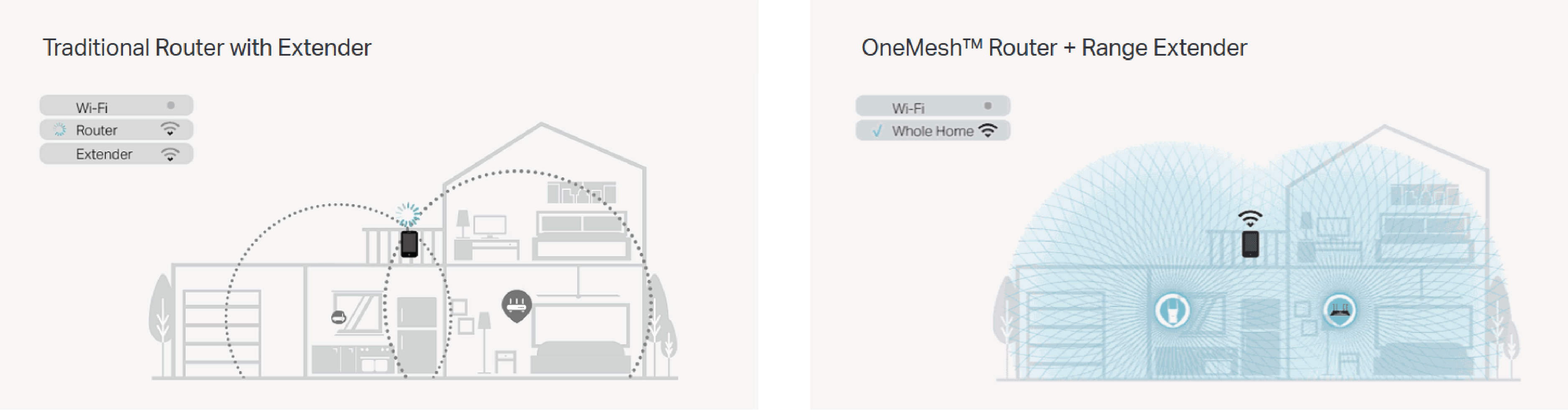 OneMesh™ is a simple way to create a Mesh network with a single Wi-Fi name, with seamless switching and whole-home coverage. Simply connect a OneMesh™ extender to a OneMesh™ router.