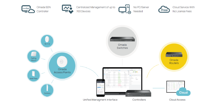 - Centralized management for up to 500 Omada access points, JetStream switches, and SafeStream routers.