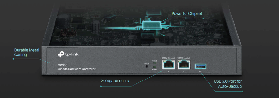The TP-Link OC300 is a dedicated hardware controller for centralized management of the Omada Software Defined Networking (SDN) platform. The device is designed for the centralized configuration, management, and monitoring of TP-Link EAP/JetStream/Omada Router access points, switches, and routers in large and medium-sized business networks. The controller is equipped with a Gigabit Ethernet port for network connection and USB 3.0 and USB 2.0 ports intended for automatic configuration backups. It supports the management of up to 500 Omada devices and up to 15,000 clients simultaneously, making it a scalable solution for high-density networks. The OC300 enables remote cloud access and local access via a web interface, eliminating the need for a dedicated PC server to host the controller software. It is powered by an external $12\text{ V}/1\text{ A}$ DC power adapter and is designed for rack mounting ($1\text{ U}$).
