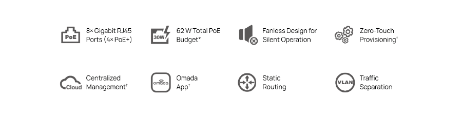 | Interface | • 8× 10/100/1000 Mbps RJ45 Ports (Ports 1–4 Support 802.3at/af PoE+) • Auto-Negotiation/Auto MDI/MDIX |