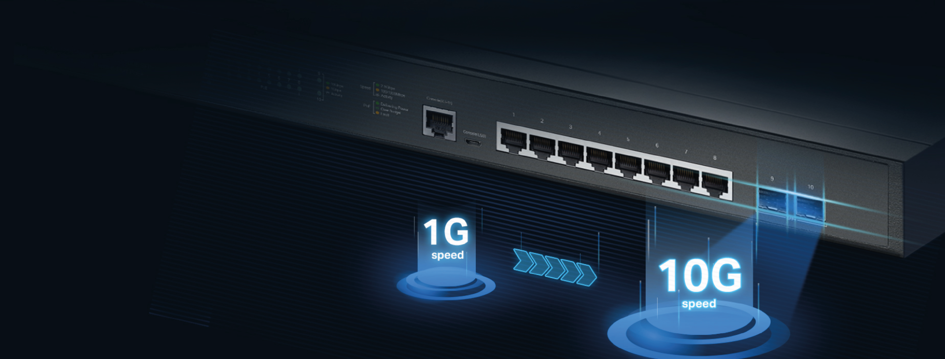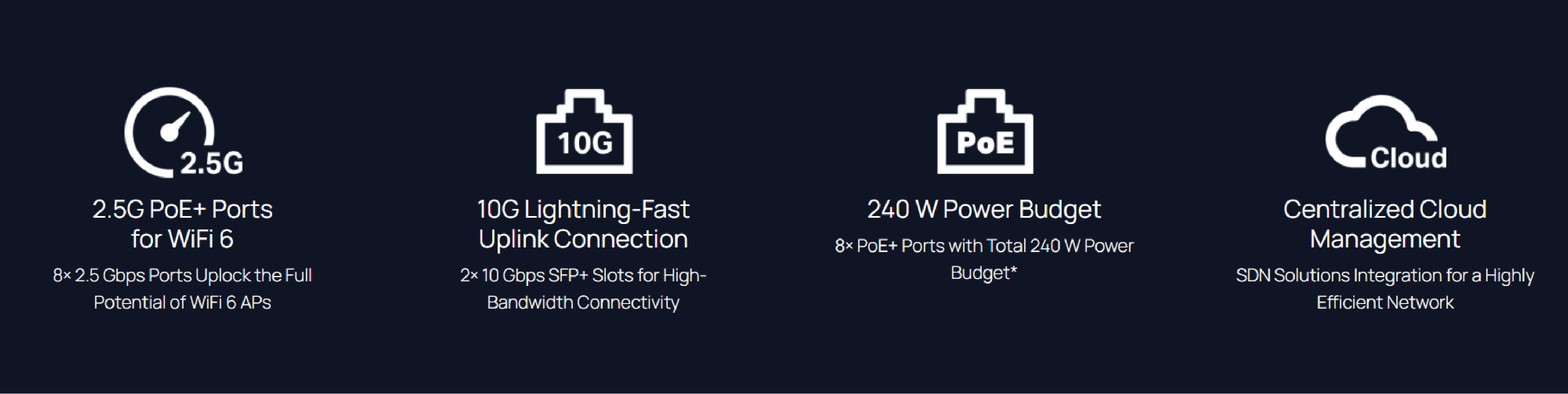 | Ports | • 8× 100/1000/2500 Mbps RJ45 Ports • 2× 10G SFP+ Slots • 1× RJ45 Console Port • 1× microUSB Console Port |