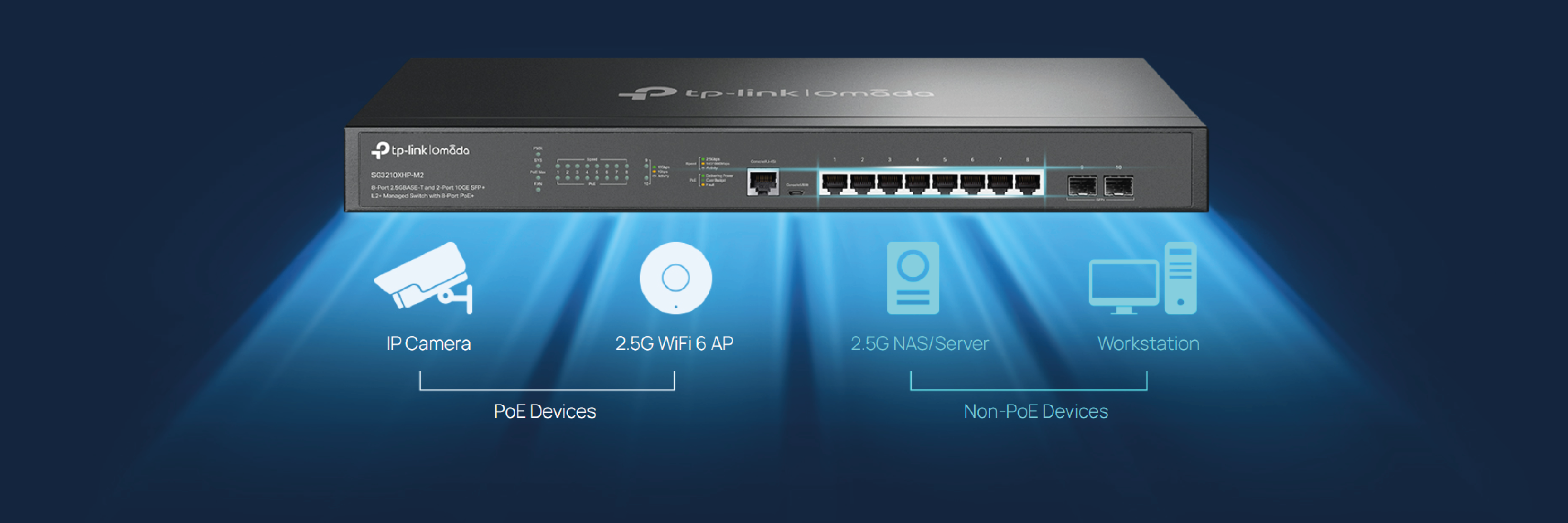 The SG3210XHP-M2 is a managed L2+ layer JetStream network switch integrated with the Omada SDN system, designed for environments requiring high throughput and high-power PoE supply. The device is equipped with 8 ports of 2.5 Gigabit Ethernet (2.5G), all supporting the PoE+ standard (802.3at/af), with a total PoE power budget of 240 W (up to 30 W per port). Additionally, the switch features 2 SFP+ 10 Gigabit (10 Gbps) slots, which serve as uplink ports for high-speed connection to the backbone network or servers. The switch supports L2/L2+ features, including static routing, VLAN 802.1Q, Link Aggregation Control Protocol (LACP), and advanced Quality of Service (QoS) mechanisms. The total switching capacity is 80 Gbps. Thanks to integration with Omada SDN, it enables centralized cloud management. The device is suitable for 13-inch Rack mounting and is equipped with an active cooling system (fans).