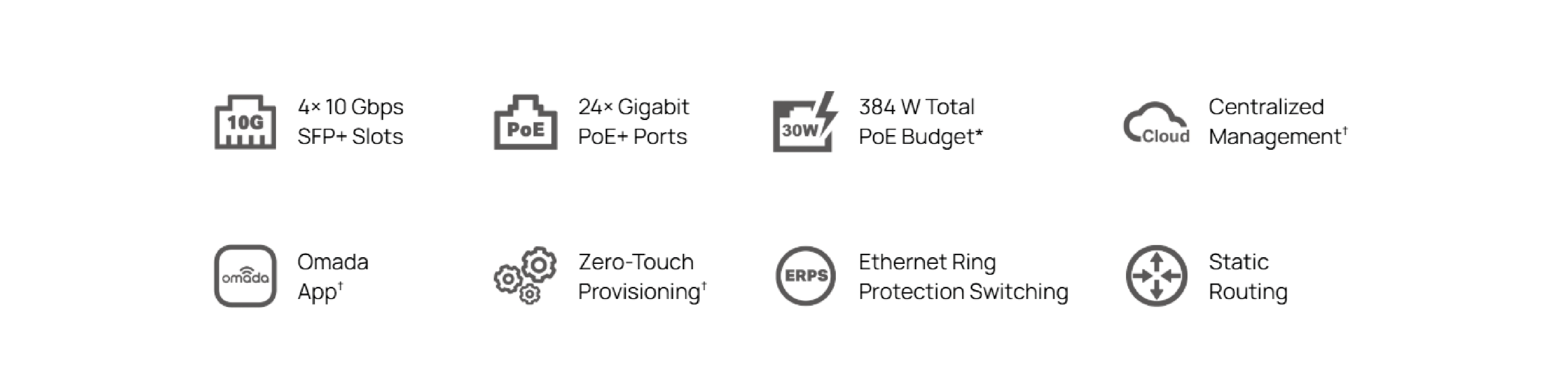 | PoE+ Ports(RJ45) | • Standard: 802.3at/af compliant • PoE+ Ports: 24 Ports, up to 30 W per port • Power Budget: 384 W |