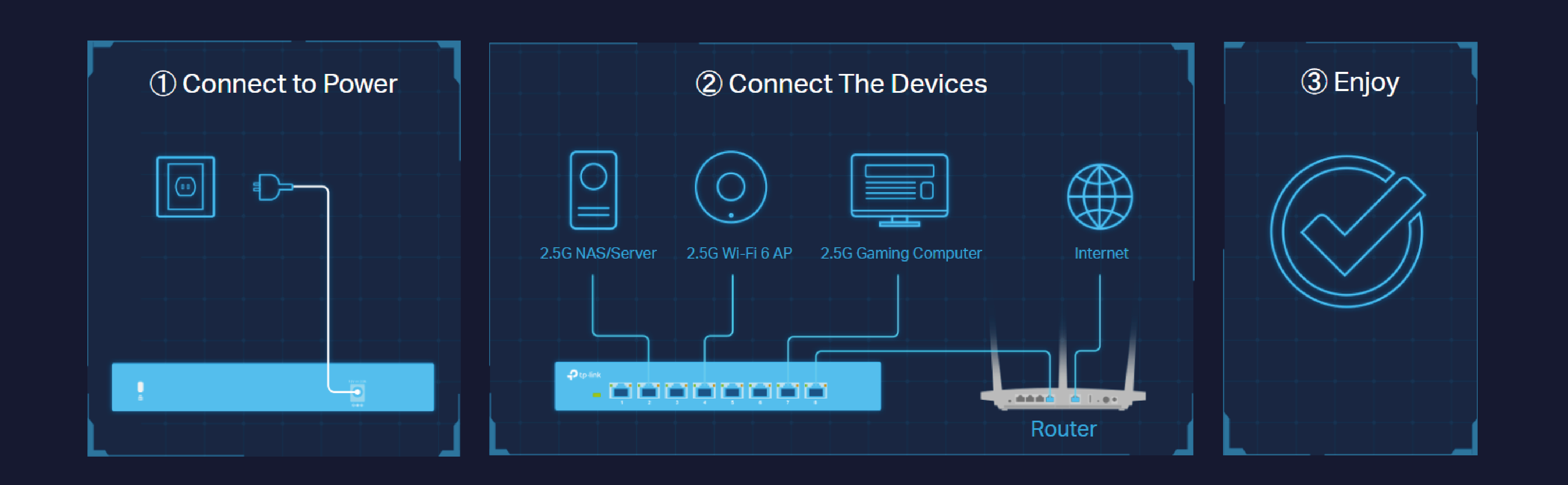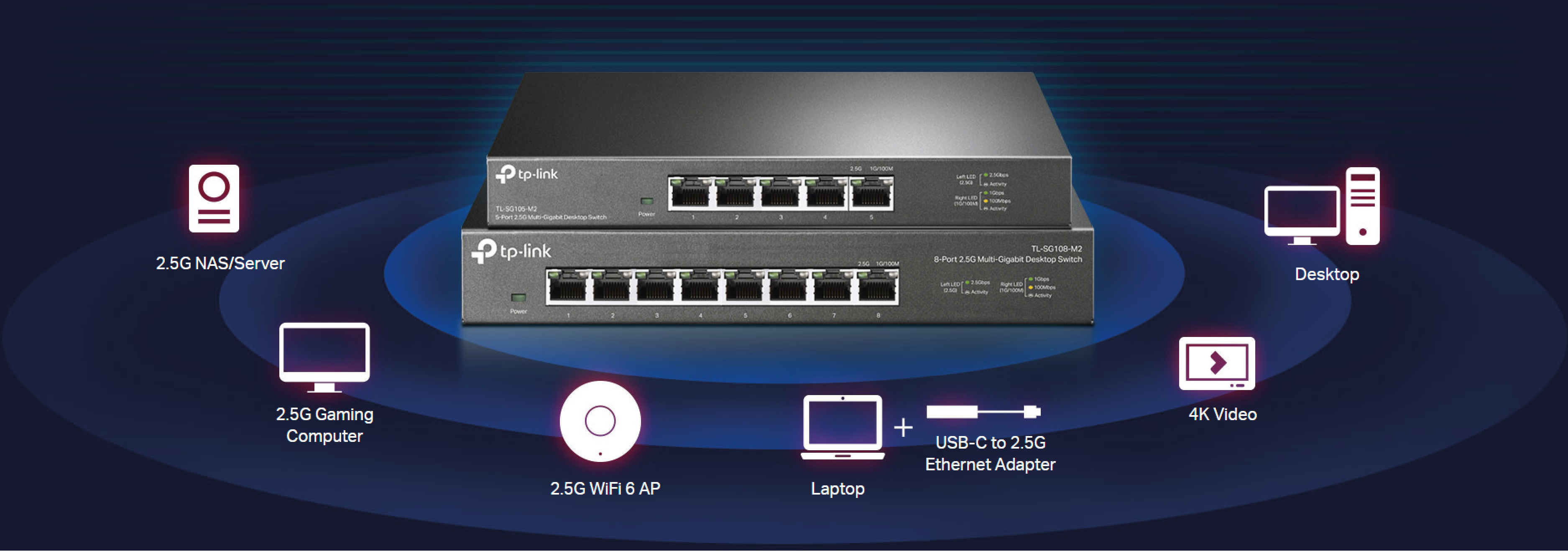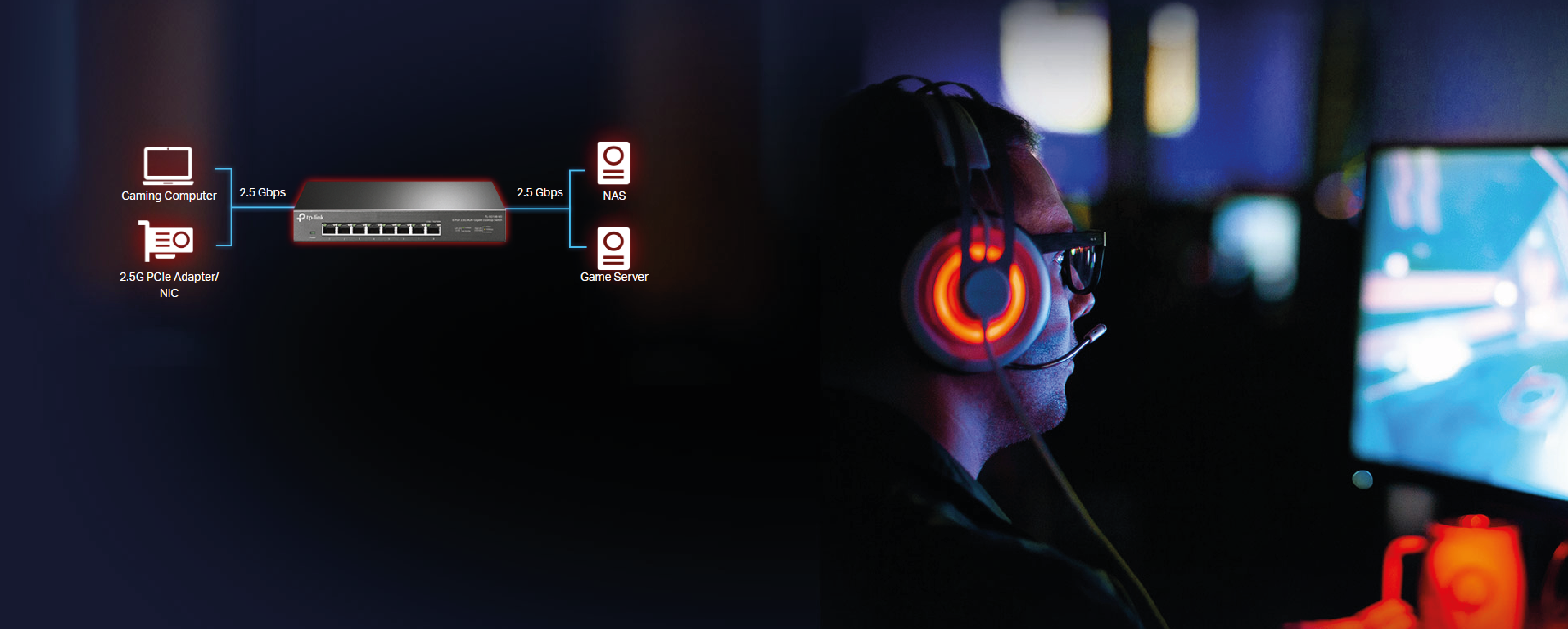TP-Link's flagship switches are equipped with 5/8 2.5-Gigabit ports, allowing them to fully utilize the potential of multi-gigabit networking and technologically advanced devices, while providing 25 Gbps switching capacity. The availability of three different connection speeds (100 Mb/1 G/2.5 G) with auto-negotiation allows for detecting link quality and intelligently adjusting speed to ensure optimal operation for all devices, including 2.5G NAS, PCIe network cards, gaming consoles, VR gaming equipment, 2.5G Wi-Fi 6 access points, and many others.